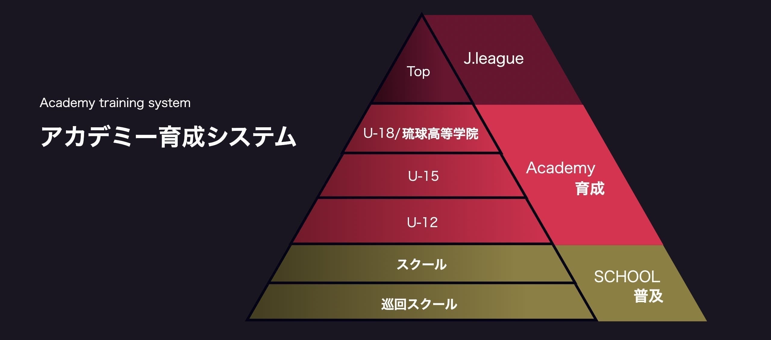 FC琉球のアカデミーの理念は「沖縄県のJリーグクラブとしてプライドを持ち、一貫体制のもとプロ選手および沖縄県をリードする人材育成を目指す」というものです。トップチームを頂点に、U-18/琉球高等学院、U-15、U-12のアカデミー育成年代や、小学生以下のスクールにも力を入れて指導体制を整えています。