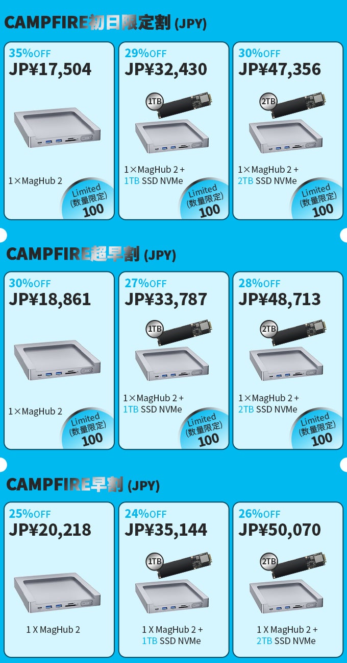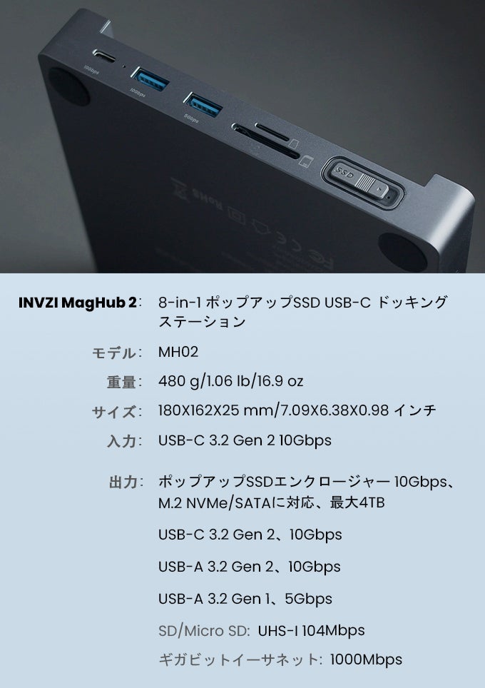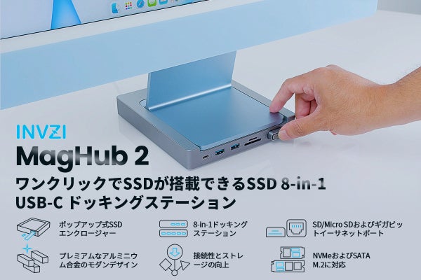 特許申請中のポップアップSSD(ソリッドステートドライブ)デザイン、MagHubはツールを使用せずにSSDメモリを完全にインストールすることができます。アルミニウムの筐体はドッキングステーションから取り外すことができます。MagHubはデータ共有をこれまで以上に便利にします。