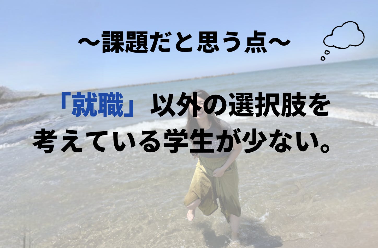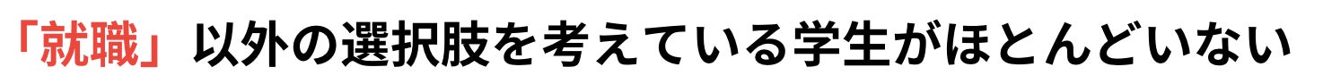 大学生の間、バイト、勉強、遊びを繰り返す日々を過ごした場合、卒業時に急に「起業する」という選択肢をもつことは難しく、結果的に「就職をする」しか選択肢が残されていないのではないかと思います。(もちろんそういう方もいらっしゃいます)