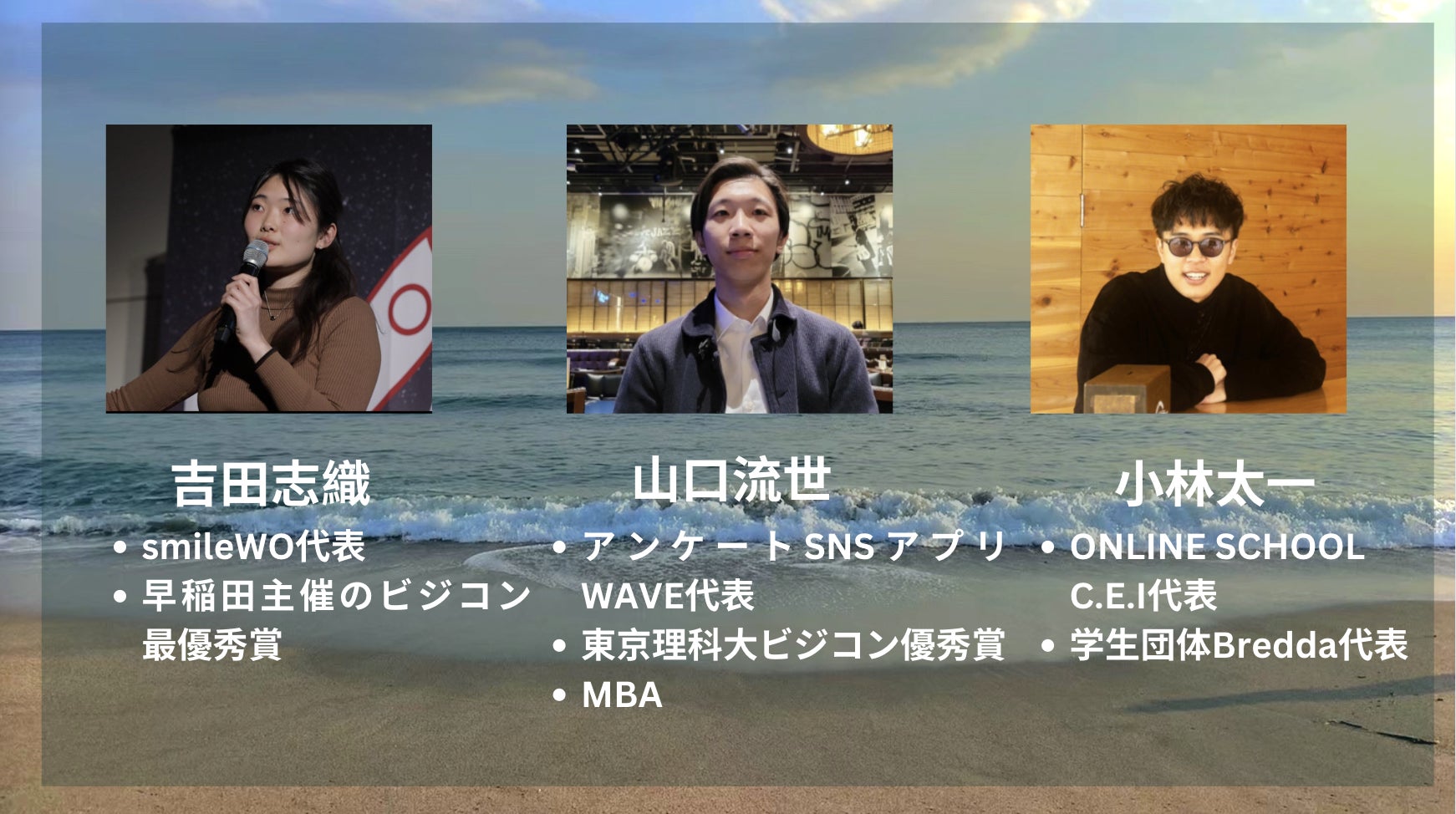 実は、ビジコンの主催は今年の夏で4回目です。私は大学一年の時に学生団体smileWOを立ち上げ、「ビーチでビジコン」以外にも「遊ぶビジコン」や「クリスマスでさえビジコン」といったエンタメ✖️ビジコンを企画・開催してきました。