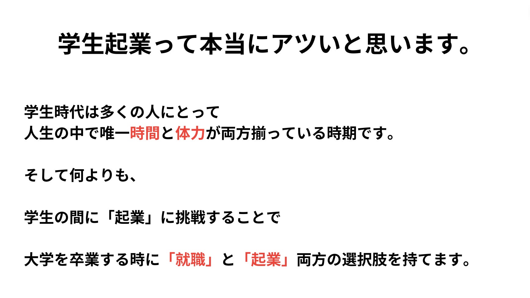 就職が悪いと言っているわけではありません。ただ、大学卒業後は起業して自分のビジネスを持ち、起業するという選択肢もあって良いのではないか?と思いました。