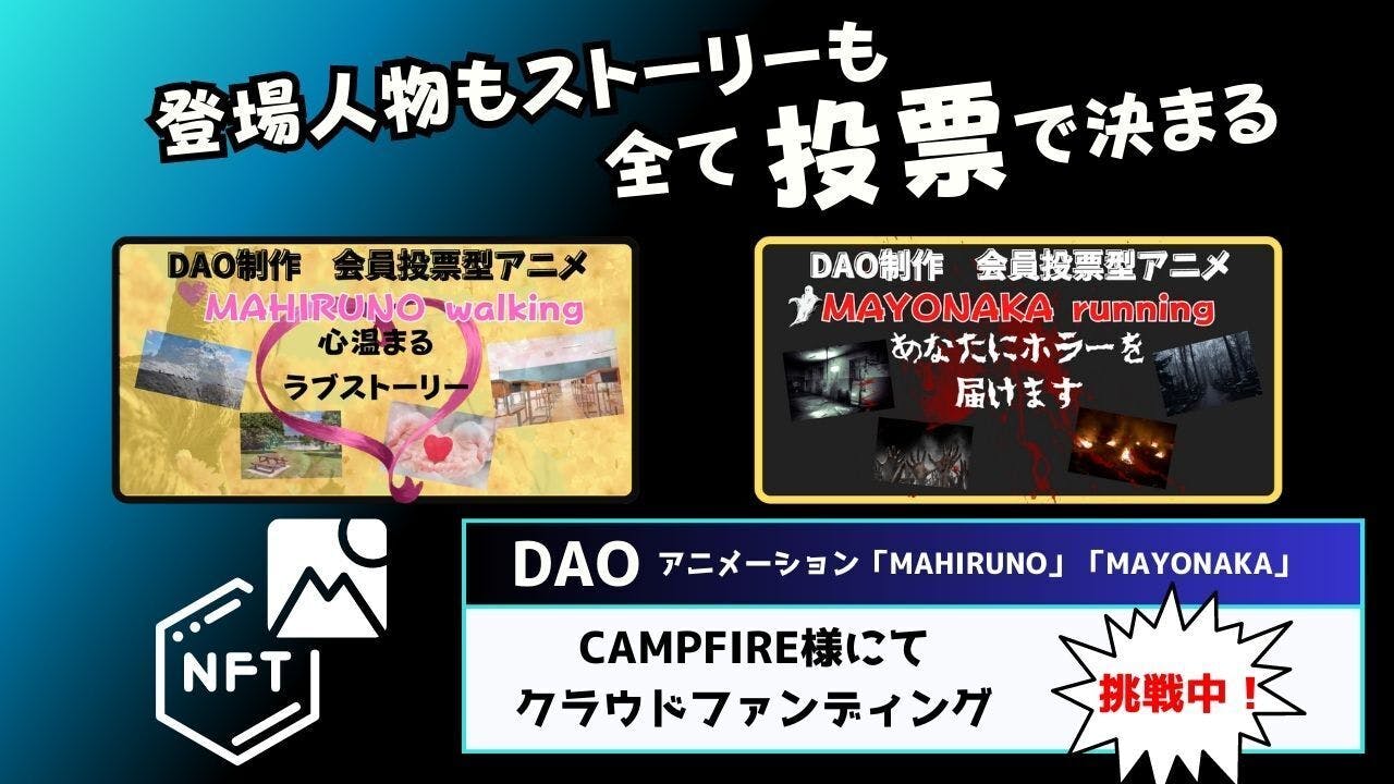 私が作るDAOのMAYONAKAとMAHIRUNOに裁きを下すのはあなたです。これまでのクリエイターのみでトップダウンの中で創られたアニメを選択するか?それとも新時代に合ったアニメも活用し、製作委員会方式のトップダウンのアニメとフラット組織のDAOアニメーションで面白いアニメを創作するか?