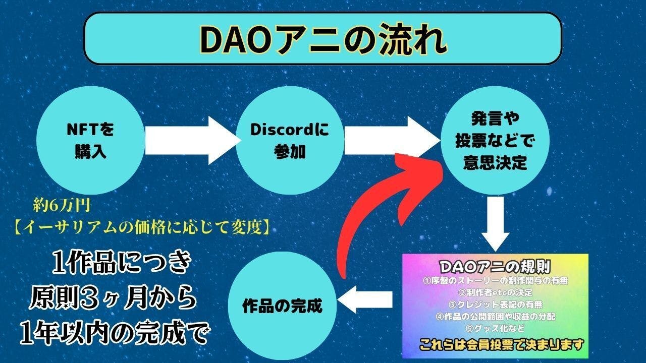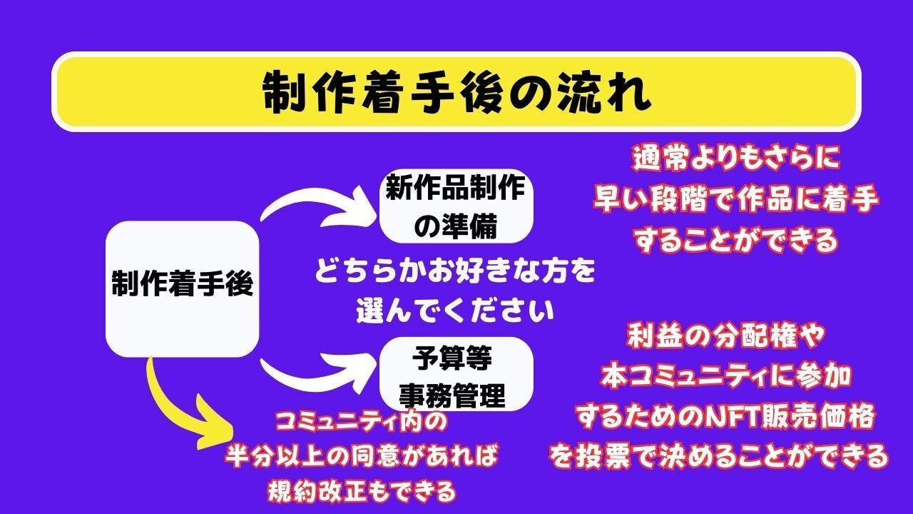 ※「本プロジェクトは私自身がアニメ制作会社を運営しているわけでもなく、アニメ制作会社に私自身が依頼するわけでもありません。あくまでNFTを購入した参加者がどのアニメ制作会社に依頼するかを意思決定することになっています。
