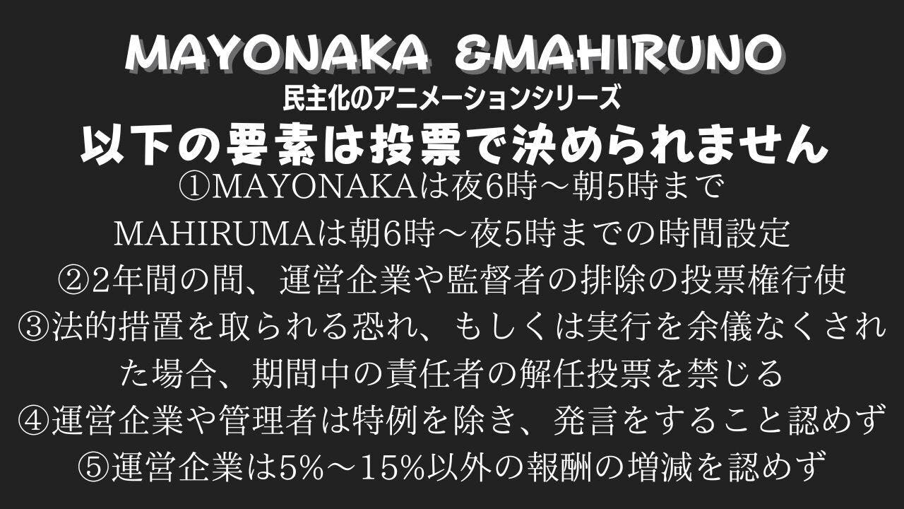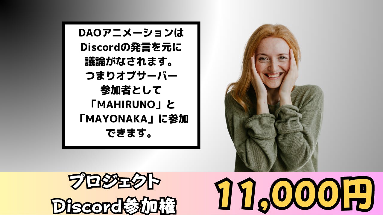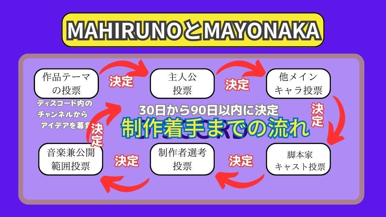今回のプロジェクトのMAHIRUNOとMAYONAKAは意思決定が製作委員会方式でもスポンサーでもなく、購入者がDiscord内で議論し、議論した結果を元に多数決を行い、その意思決定を管理会社が忠実に実行するシステムです。
