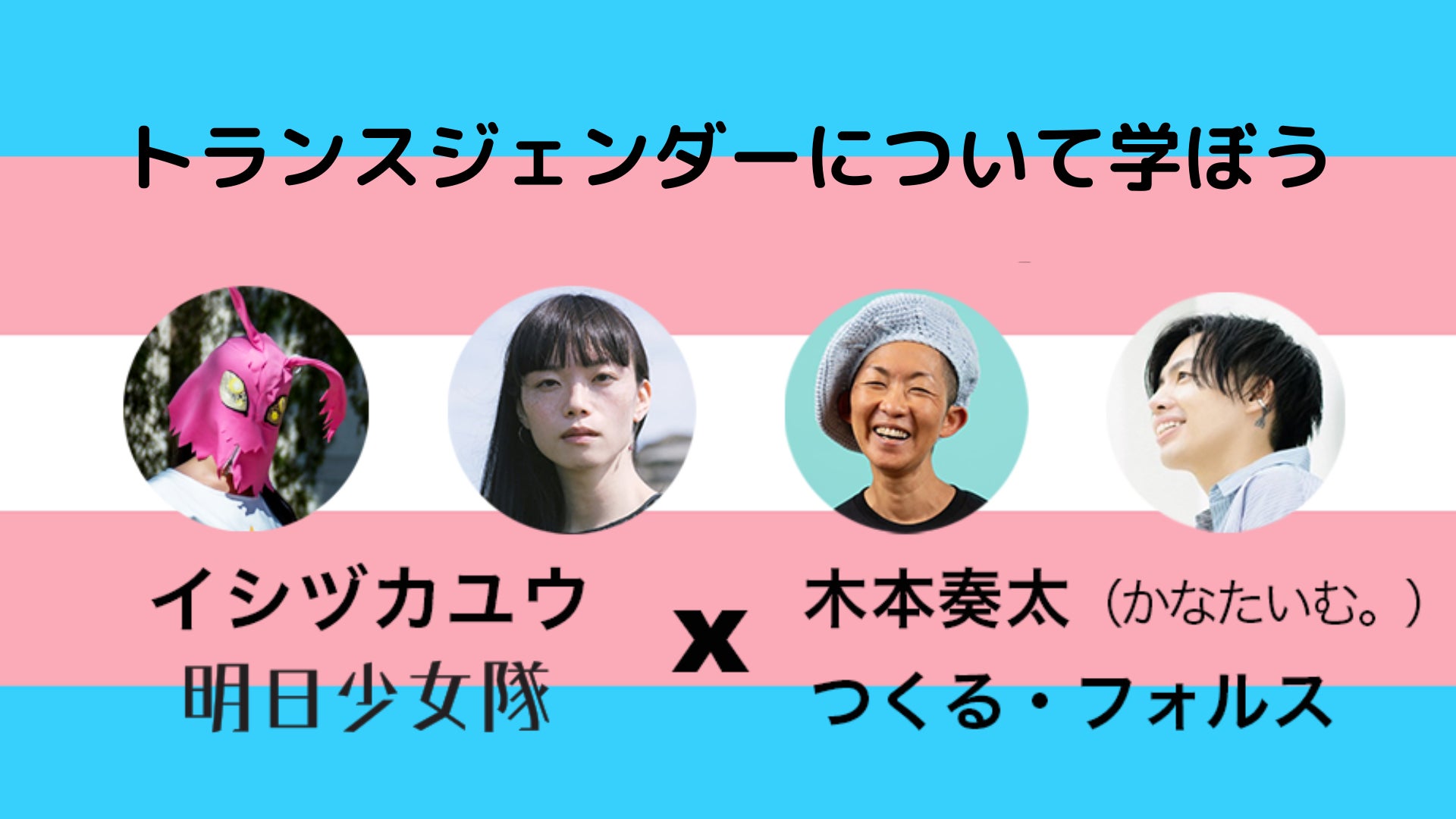 メインの90分の対談にはトランスj当事者でファッションモデルのイシヅカユウさん、YouTuber(かなたいむ。)の木本奏太さん、ロサンゼルスからは全米トランス・ライツ・アクション・デイ発起人のつくる・フォルスさんをお招きしております。イントロのレクチャーでは、明日少女隊からトランスジェンダーとは何かについてわかりやすくお話しします。