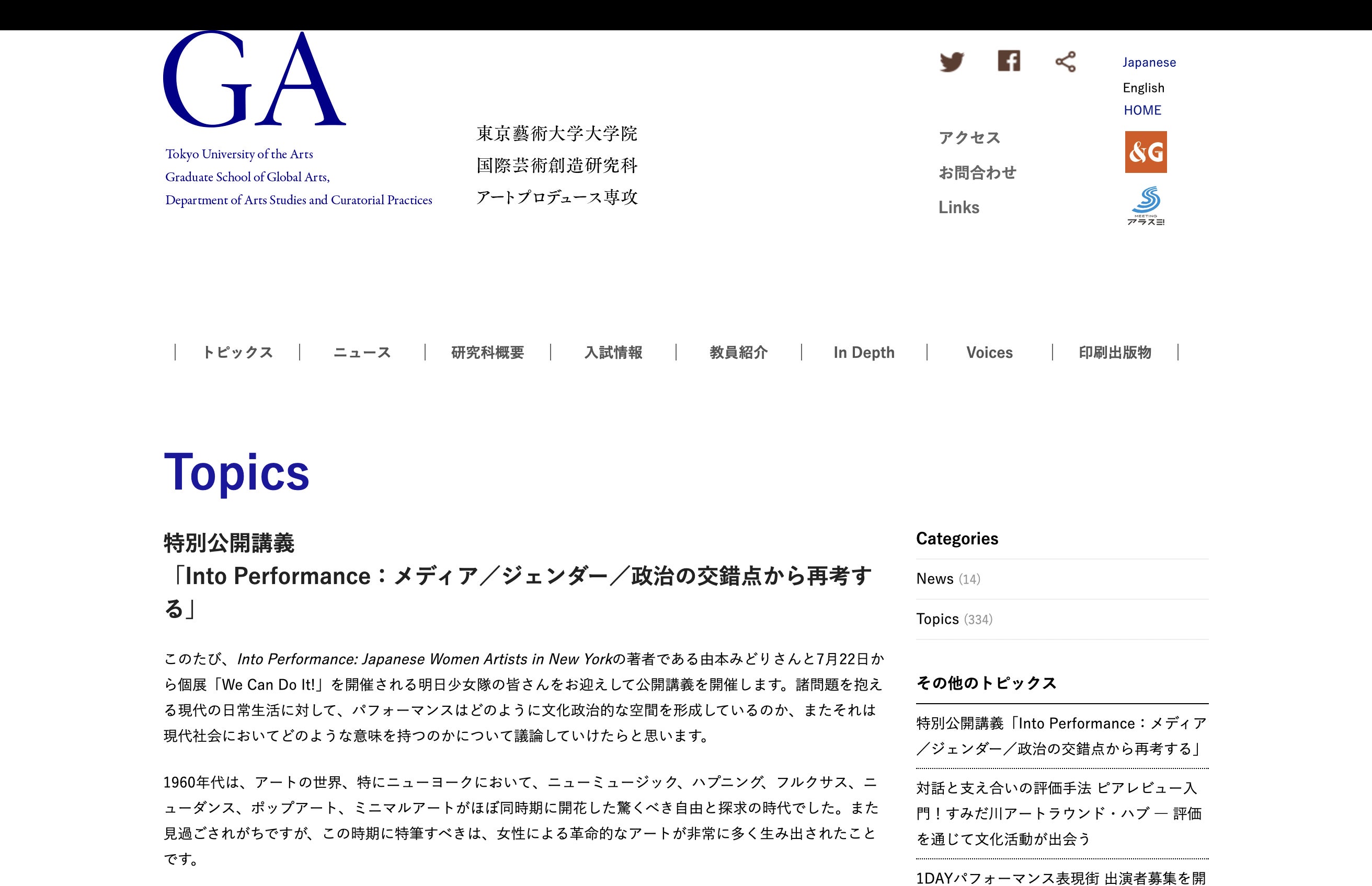 明日少女隊は、7月18日18時より、東京藝大での特別公開講義で登壇することになりました。ぜひ、皆様、お誘い合わせの上、ご参加ください。明日少女隊と一緒に登壇するのは、ニュージャージーシティー大学教授の由本みどりさんです。アメリカに渡って開花した60年代の日本人女性アーティストについてお話しされます。明日少女隊は、日本の美術系大学での初の講義となりますので、フェミニズムとは何か?フェミニスト・アーティストとは?という基本のところから、私たちのアート&アクティビズム作品の紹介をさせていただきたいと思っております。講座のお申し込みはこちらから特別公開講義「Into Performance:メディア/ジェンダー/政治の交錯点から再考する」(日本語)http://ga.geidai.ac.jp/2023/06/29/into-performance/英語のページはこちらhttp://ga.geidai.ac.jp/en/2023/06/29/into-performance/みなさんにお会いできるのを楽しみにしております!