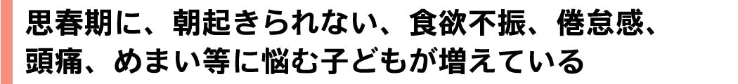 これらの症状が特徴の「起立性調節障害」という病気は小学校の高学年から中学生頃の思春期に多く発症し、小学生の約5%、中学生の約10~30%がかかると言われています。