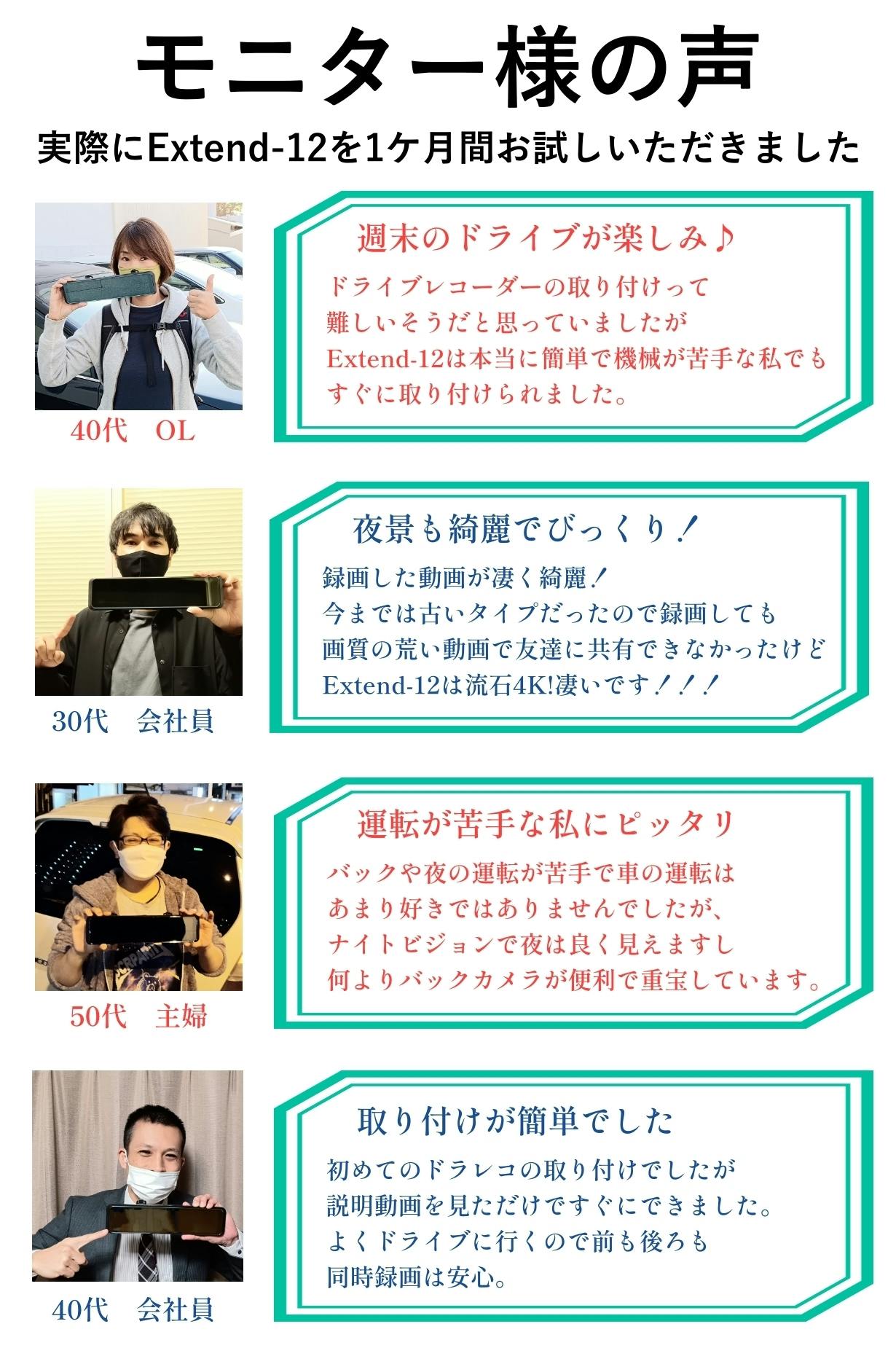 高性能でありながらもミラー型ドライブレコーダーの入り口として、機械に弱い人でも、スマホ感覚で気軽に使えると思いますので、是非そんな思いを込めたこのExtend-12をお試し頂きたく思います。