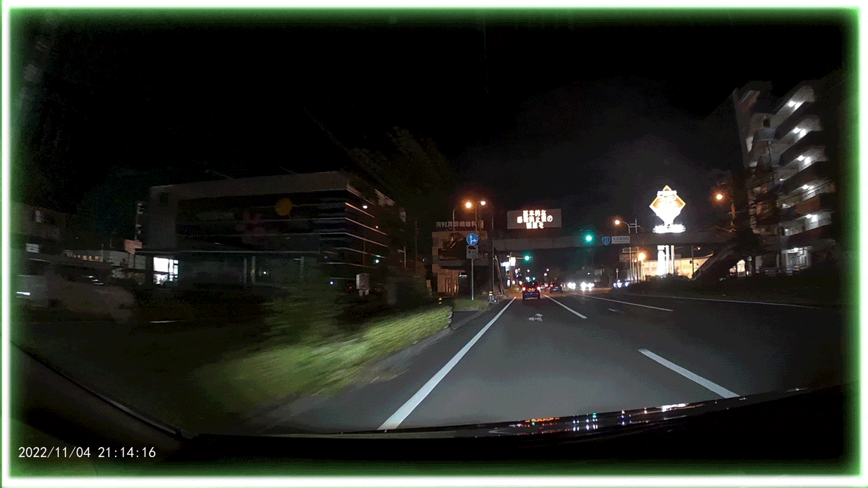通常のビデオカメラや安物のドラレコでは、西日本地域でLED信号の光が一定時間映らなくなるという致命的な現象が起こります。当製品ではカメラの撮影速度を27.5fpsに変更することでこのトラブルを回避しています