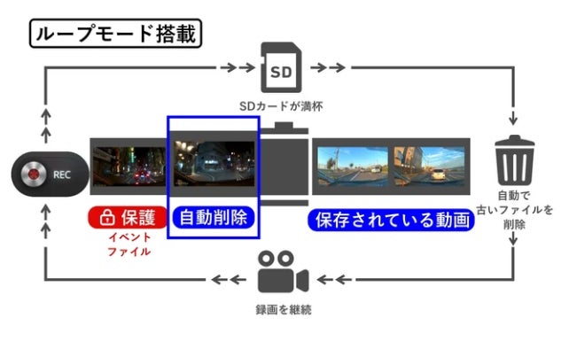 Extend-12はSDカードに録画データがいっぱいになってしまっても自動的に古いファイルが削除されるループ機能を搭載さいております。