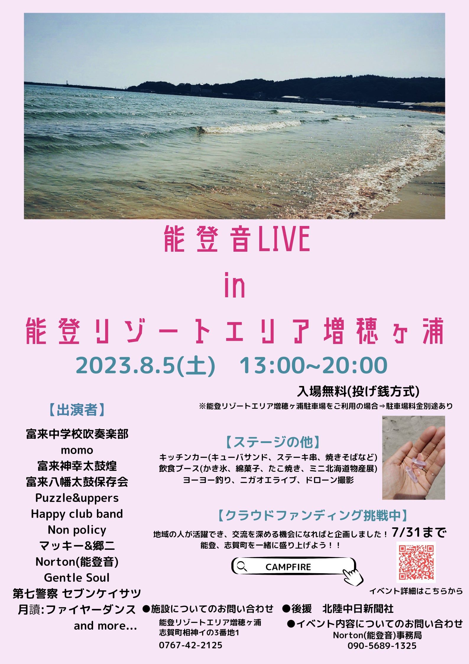 皆様お疲れ様です。猛暑が続いておりますが、お元気にお過ごしでしょうか?8/5(土)「能登音LIVE in 能登リゾートエリア増穂浦」は無事開催する事が出来ました。実は今回、猛暑のため富来中学校吹奏楽部の突然の出演キャンセル、さらに近辺でコロナ感染者の増加もあり、職業柄モヤモヤとした状況下での開催となりました。こんな時期にこんな事をしていて良いのだろうか、、と一時期落ち込んでいました。けれど、沢山の出演者、出店者、施設の方、お客さん、クラウドファンディング支援者の皆さんの応援の声、「楽しかった」「ありがとう」という言葉に救われ、今は開催して良かったと思っています。暑すぎたこと、イベントが近辺に重複していたこと、主催者の力不足等で、当初の目標であった集客についてはあまり良い結果ではありませんでしたが、皆さんが健康で無事終われたことが何よりだと感じています。来年は反省点を踏まえて、より沢山の人に志賀町、富来の魅力が伝わるように再度計画したいと思います。本当に暑い中、関係者の皆様、ありがとうございました!!!※支援者の皆様には、支援金の使い道など別途メールいたします。