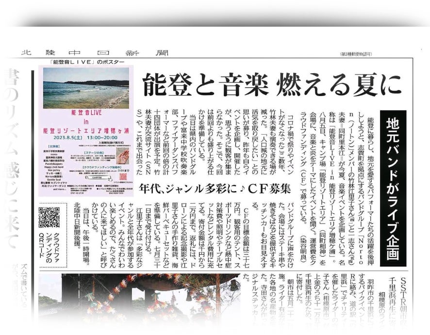 皆様ご支援ありがとうございます!!能登音事務局のERIです。蒸し暑い日が続いていますが、皆様お元気でしょうか?先日の大雨で被害に逢われた方には、心よりお見舞い申し上げます。さて本題となりますが、7/1(土)の北陸中日新聞朝刊に能登音LIVEの記事を掲載していただきました!大きく載せてもらって喜んでおります。是非当日は沢山の方に遊びに来ていただきたいです!そして、リターンのネックレス、キーホルダーも製作に取りかかりました。心を込めて一つ一つ手作りしています。嬉しいことに残りわずかとなっています!イベントの8/5まで残り1ヶ月となりました。バンド練習にリターン製作、台本作成、フライヤー配布、などなど、、と、やる事も沢山ありますが、楽しんで準備しておりますので、皆様引き続き応援お願いいたします!!