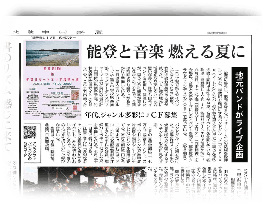 さて本題となりますが、7/1(土)の北陸中日新聞朝刊に能登音LIVEの記事を掲載していただきました!大きく載せてもらって喜んでおります。是非当日は沢山の方に遊びに来ていただきたいです!