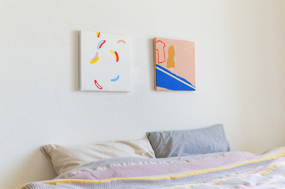 日常で目にする物や空想のシーンをモチーフに描いた原画を、シルクスクリーンプリントで捺染したファブリックパネルです。ファブリックパネルとは、リビングはもちろん寝室や玄関など、あらゆるお部屋の壁に飾って頂ける装飾品です。Kalappoのファブリックパネルは30cm×30cmとなっており、どのお部屋に飾っても程よい大きさで気分によって付け替えも簡単。素敵なインテリアへの入門編としてうってつけです。掲載しているデザインの他にも、全部で12種類のデザインがあります。プリントの元となる原画は全て手描きで描いており、シンプルな図案の中にも柔らかな雰囲気が出るように、形の細部までこだわっています。全てコットン100%のファブリックから出来ているため、絵画よりも親しみやすくナチュラルな風合いが魅力的です。