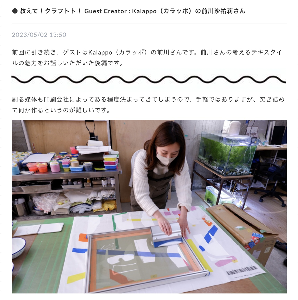 インタビューでは、テキスタイル「Koti」の製作過程やシルクスクリーンプリントの魅力などについて、前半と後半の二回に渡りお答えしています。Kalappoデザイナー前川の、頭の中が垣間見える内容になっております。是非ご覧ください!