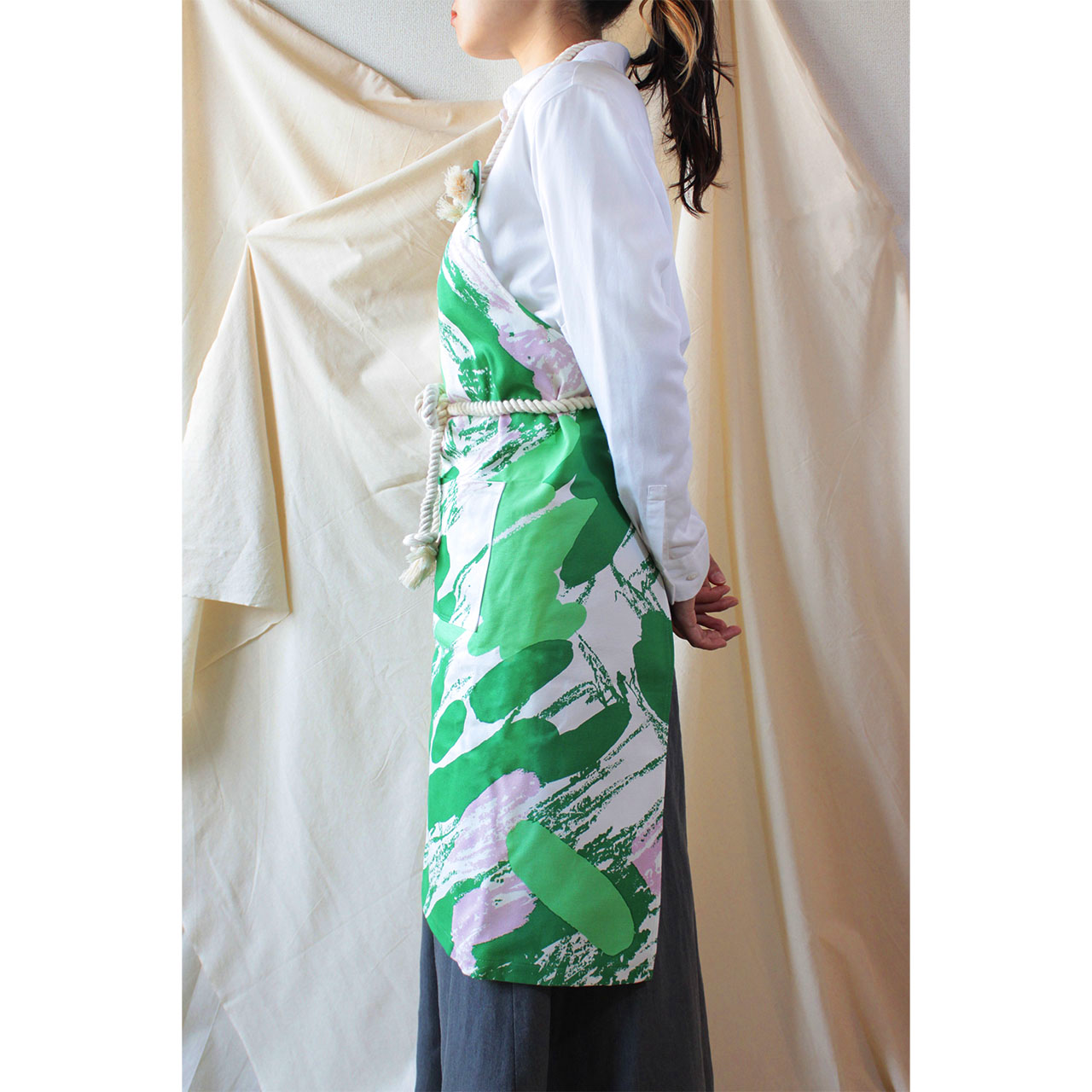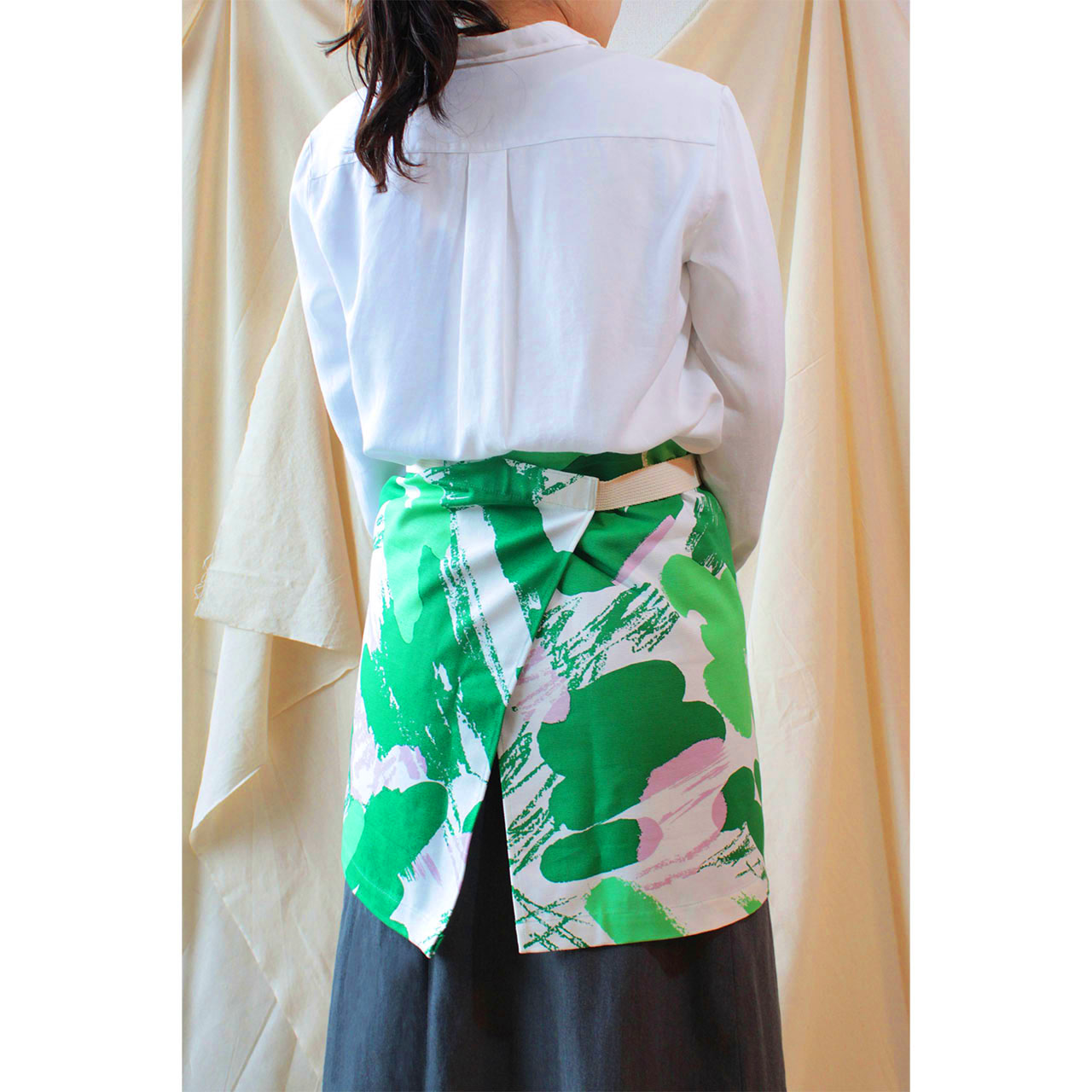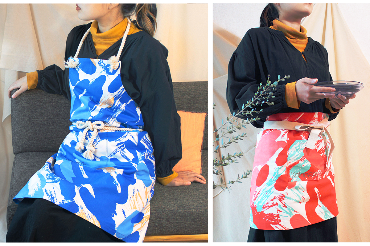 オリジナルテキスタイル「Tuuli」を使用したエプロンと腰エプロンです。Tuuliは、フィンランド語で「風」を意味します。生まれたての春風をイメージしたテキスタイルで、着るだけで気持ちがパッと明るくなるエプロンを作りました。