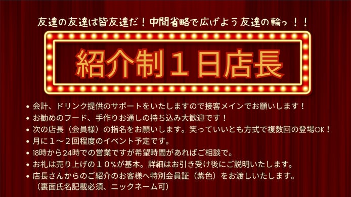 1日店長さんのご紹介で当日ご来店いただいたお客様には今後は会員様としてご支援いただけるようお願いしたく存じます。