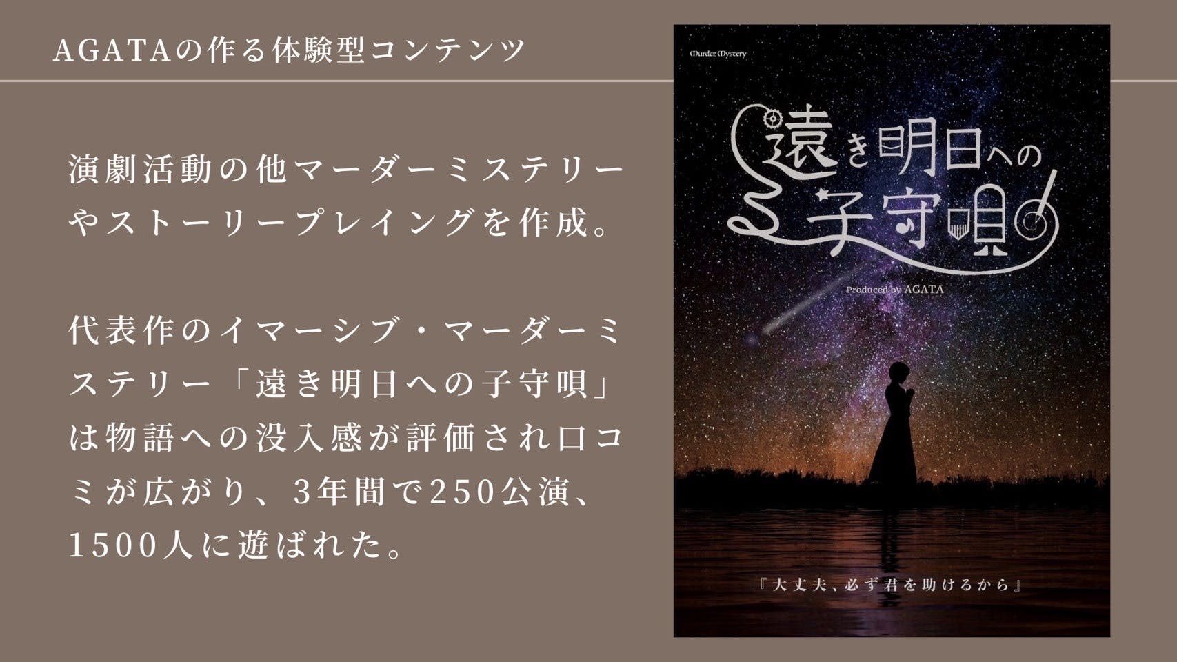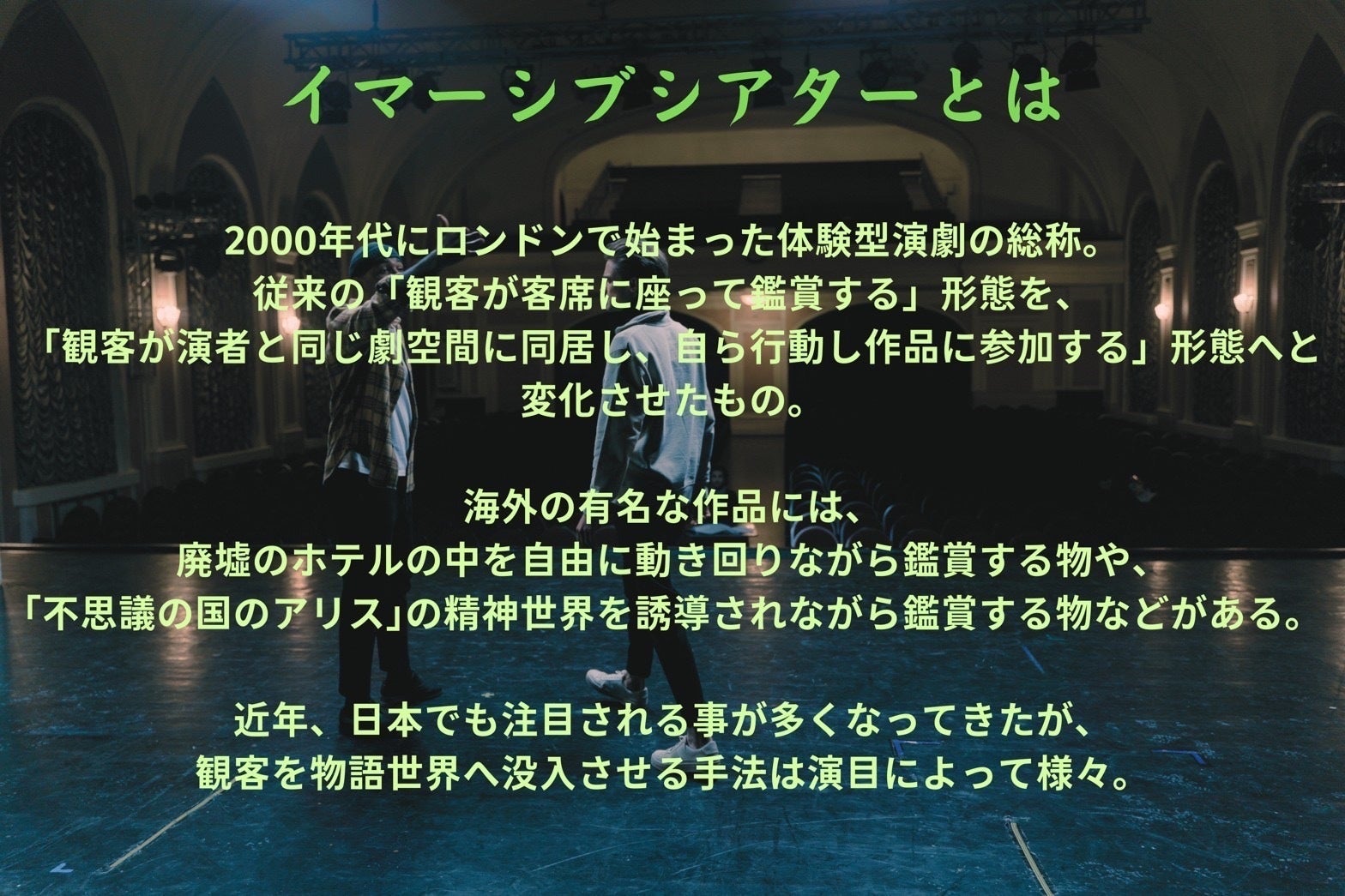 私たちは、従来の演劇の《客席に座って物語を観る観劇体験》ではなく、《お客様自身が登場人物となって行動する没入体験》を提供する公演を製作しています。