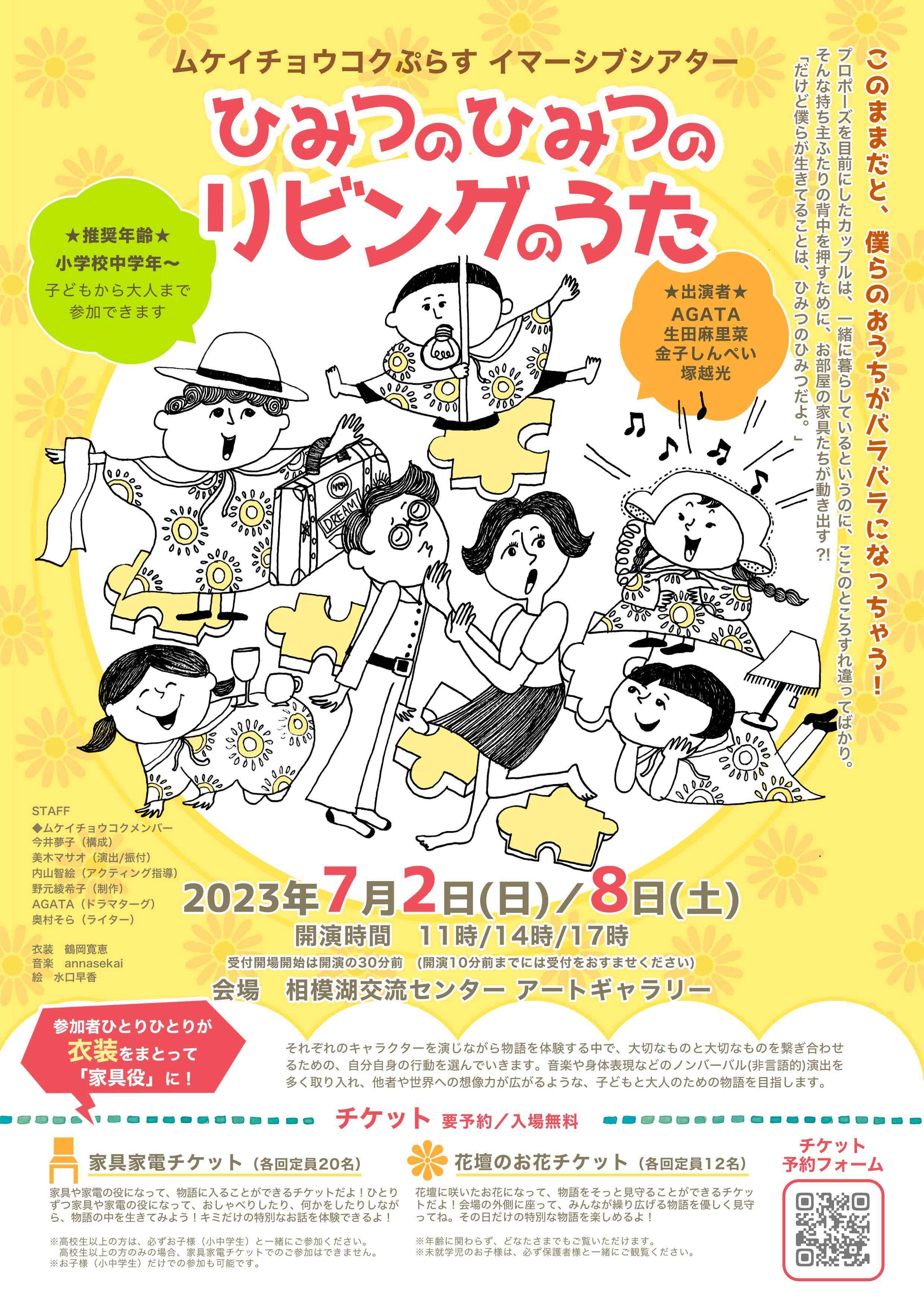 2023/10/01 09:02皆様からお寄せいただきました熱い熱い応援のおかげで、『ひみつのひみつのリビングのうた』次回公演が決定いたしました!10/22(日)神楽坂まち飛びフェスタ@白銀公演にて上演いたします⭐︎特設サイトはこちらトライアル公演のときには、ご予約時にお選びいただいていた【家具家電】と【花壇のお花】の参加方法を、今回公演では当日ランダムに振分けるスタイルに!トライアル公演での【家具家電参加】は《お子様&お子様とご一緒の大人》限定でしたので、今回は大人の皆様もどなたでも、子どもたちと一緒にプロポーズを応援していただけます(o>ω<o)さらに!お祭り会場での上演ということで、今回はちんどん屋さんキャストも登場します⭐︎この作品も、まち飛びフェスタも、ワクワクいっぱいに盛り上げますよ〜((o(*>ω<*)o))トライアル公演での様子登場人物として物語を体験するムケイチョウコクのイマーシブシアター、 この『ひみつのひみつのリビングのうた』は、赤ちゃんからおじいちゃんおばあちゃんまで、みんなで楽しむことのできる作品です。今回は公園での上演となるので、お散歩気分でご参加いただけますよ(^○^)トライアル公演の上演風景小学生以上のお子様から参加できる【家具家電役】では、ひとりひとりが可愛い衣装を身につけ、カップルを応援するお家の家具や家電の役として物語に参加していきます。やる気満々さんも恥ずかしがり屋さんも、みんなそれぞれの個性のまま、自分だけの物語のなかで、もしかしたら見たことのない我が子やママやパパやお友達の姿を、新しい自分を、見つけるかもしれません。家具家電役での参加者たち赤ちゃんからご参加できる【花壇のお花役】では、お家の周りの花壇の席で、お花を手に、お花になって物語を見守ります。声を上げて笑っちゃってももちろん良いし、応援もできます。泣いちゃったり飽きちゃったり、そんな時はそっと席を離れて良いし、またいつでも戻ってきて大丈夫。「役になるのは恥ずかしいから観てるだけ」も、もちろん大歓迎です。花壇のお花役での参加者たちトライアル公演にご参加くださった皆様には、ぜひまた違う役にもなってみてほしいし、まだ参加されたことのない方には、もうもうぜひぜひ!この作品を体験してほしい!その日その場で集まったばかりのメンバーだなんて信じられないくらい、素敵な愛おしい物語ができあがるのです。活き活きと物語に生きるみんなの真実が、きっとあなたの一日を優しく豊かなものにしてくれるはず。皆様のご参加を、心からお待ちしています♪ご予約お申込はこちら神楽坂まち飛びフェスタ公演『ひみつのひみつのリビングのうた』【日時】2023年10月22日(日) 12:30/15:00※屋外のため雨天中止【場所】新宿区立 白銀公園〒162-0816 東京都新宿区白銀町3 東京メトロ東西線神楽坂駅:徒歩3分 都営大江戸線牛込神楽坂駅:徒歩5分【チケット】 大人一般:1,500円 こども一般(小中学生):1,500円 親子ペア(大人1名+小中学1名):2,500円★Special チケット(テーマソング2曲がダウンロードできるポストカード付き)★ 大人Special:2,500円 こどもSpecial(小中学生):2,500円 親子ペアSpecial(大人1名+小中学1名):3,500円 未就学児:無料 (保護者様とご一緒に花壇のお花役になります)【ご予約】お申込はこちら【当日券】前売りチケット完売後も、毎公演ご用意します!公演当日の11時半〜15時までの間に、公園内の受付にてお求めください。先着販売、売り切れ次第販売終了いたします。<CAST>AGATA 生田麻里菜金子しんぺい 塚越光〜ちんどん屋さんキャスト〜宇都有里紗/中島早紀/永峰光彩季/星野李奈松浦志帆/羽香夏/わたなべゆうた/渡邉理衣<STAFF>◆ムケイチョウコクスタッフ 今井夢子(構成) 美木マサオ(ムーブメント) 内山智絵(アクティング指導) 野元綾希子(制作) 奥村そら(ライター)衣装 鶴岡寛恵 音楽 annasekai道具 磯和武明演出 ムケイチョウコク&all cast もっと見る