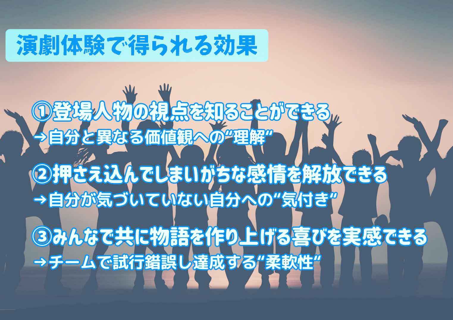 役を演じて物語を上演する《演劇体験》には、人生を豊かにする力があります。それには例えば以下のようなものが挙げられるでしょう。