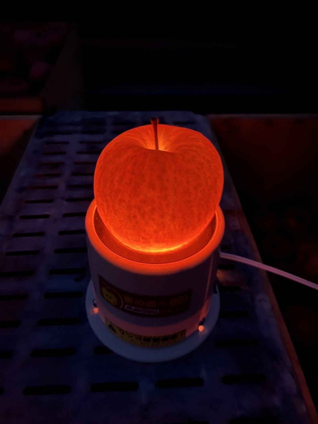 (りんごを置き特別なライトを当てることで蜜入りかどうかを判別します)