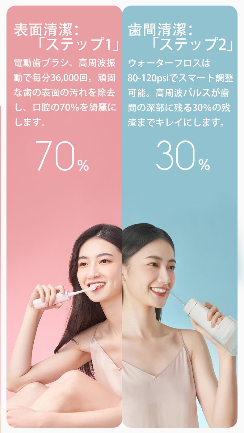 アメリカ歯周病学会によると、歯磨きとウォーターフロスを組み合わせた口腔ケアは、歯ブラシのみを使用するよりも効果的です。具体的には、歯間の食べ物の残りをタイムリーに除去します。ウォーターフロスを定期的に使用すると、以下の効果が期待できます: