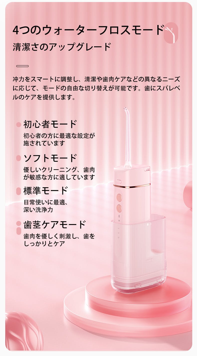 ウォーターフロスには4つのモードがあり、80-120psiでスマートに調整可能です。初心者モード:初めての方に適しています。ソフトモード:優しく洗浄し、歯茎が敏感な方に適しています。標準モード:慣れた後の日常使用に適しています。歯茎ケアモード:歯茎を軽く刺激し、歯根を強化します。