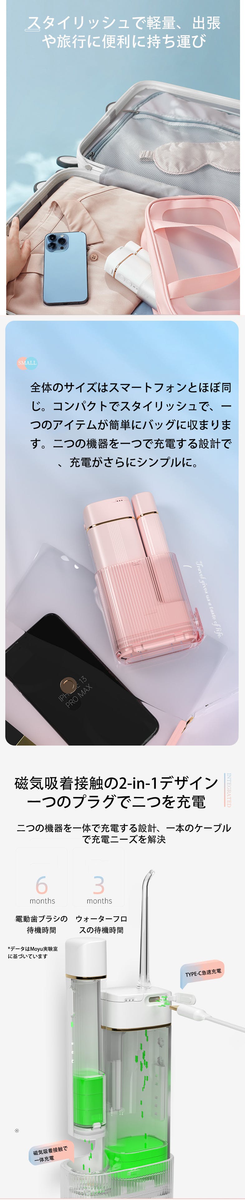 一体型の充電デザインで、本体に充電するだけで電動歯ブラシも充電できます。フル充電後、ウォーターフロスは3ヶ月、電動歯ブラシは半年の待機が可能です。Type-Cの急速充電で、一本のケーブルで充電問題を解決し、非常に便利です。全体のデザインはコンパクトで携帯に便利で、スマートフォンのサイズとほぼ同じです。オフィス、出張、家庭、旅行など、どこでも持ち運びが簡単で、快適な歯の清掃体験を提供します。