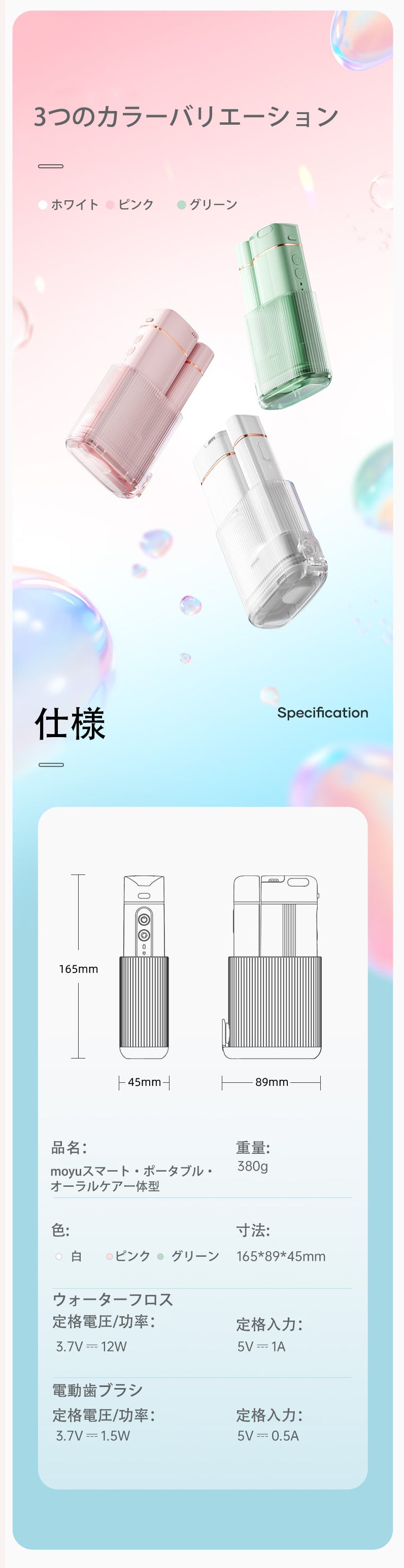 さらに、3つの色から選ぶことができます。皆さん、新しい口腔ケアの時代に一緒に乗り出しましょう!「moyu電動歯ブラシ&ウォーターフロス2-in-1」で、毎日の歯磨きをもっと効果的で快適にしましょう!