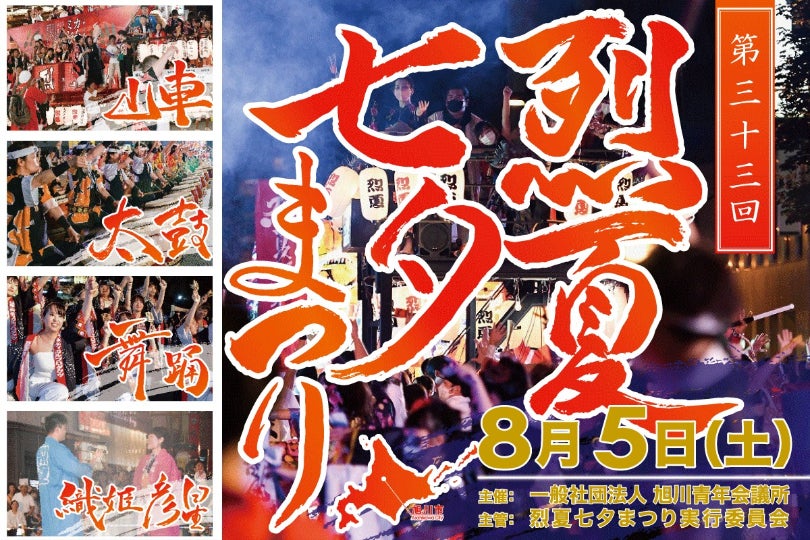 烈夏七夕まつりは旭川青年会議所や参加団体有志が中心となって運営をしております。太鼓や踊り、大小様々な行燈と美しい彩りの電飾を重ねた山車を地元の団体や子供たちと連行いたします。YOSAKOIソーランとのコラボレーションや迎え太鼓の荘厳な雰囲気、ダイナミックな迫力の山車連行、フィナーレには織姫・彦星による公開プロポーズなど、迫力のある「まつり」です。