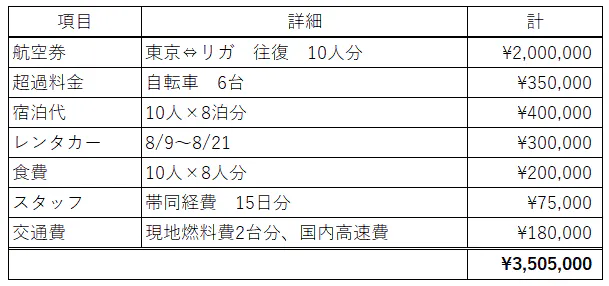遠征では、環境に慣れる期間も含め、8月9日から8月20までの12日間の滞在費と渡航費を予定しています。選手6名、監督、メカニック、マッサーなど帯同スタッフ4名、海外遠征としては最低限の合計10名分の遠征費を目標金額としました。