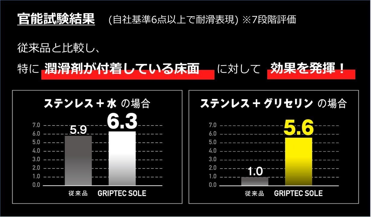 ■人間の感覚を用いて製品の品質を判定する官能試験をおこなった結果、グリップテックソールの耐滑性効果が確認できました。※自社従来品との比較
