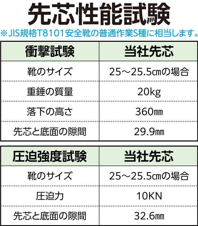 JF-S規格は広島化成が所属する日本ゴム履物協会が設定した規格になります。JF-S規格の普通作業靴S級は、JIS規格(JIS T 8101)で定められたS種普通作業用と同等の鉄芯基準になります。