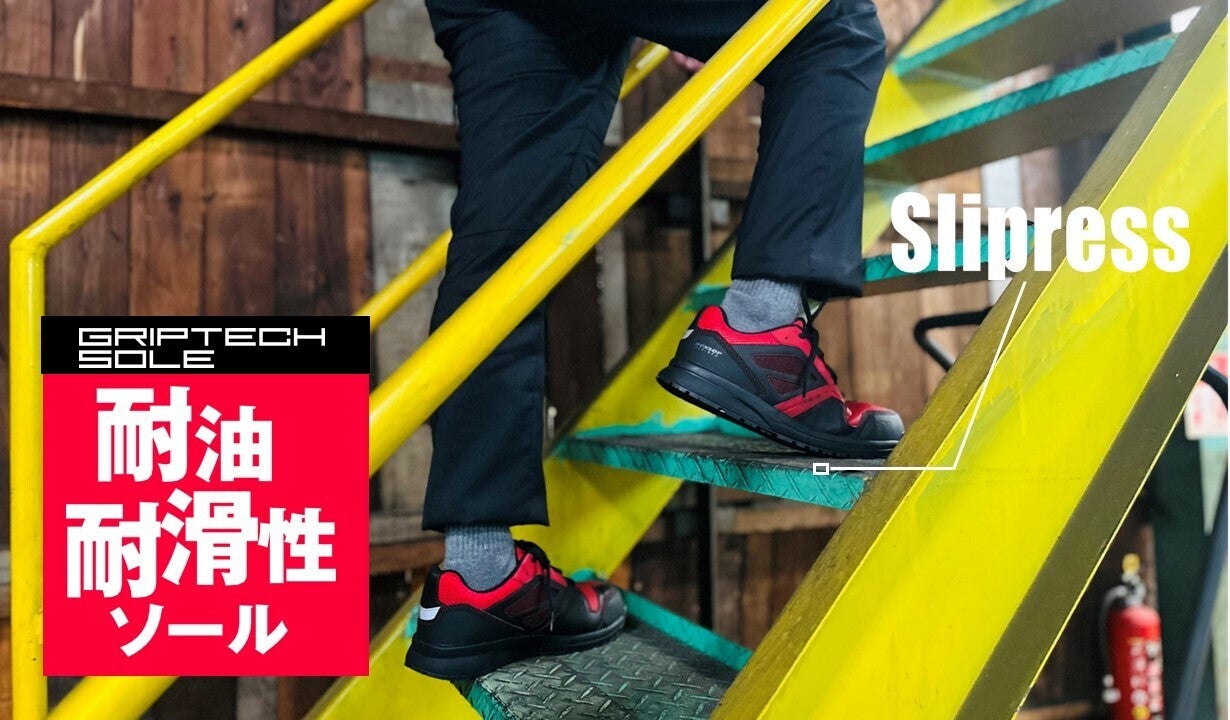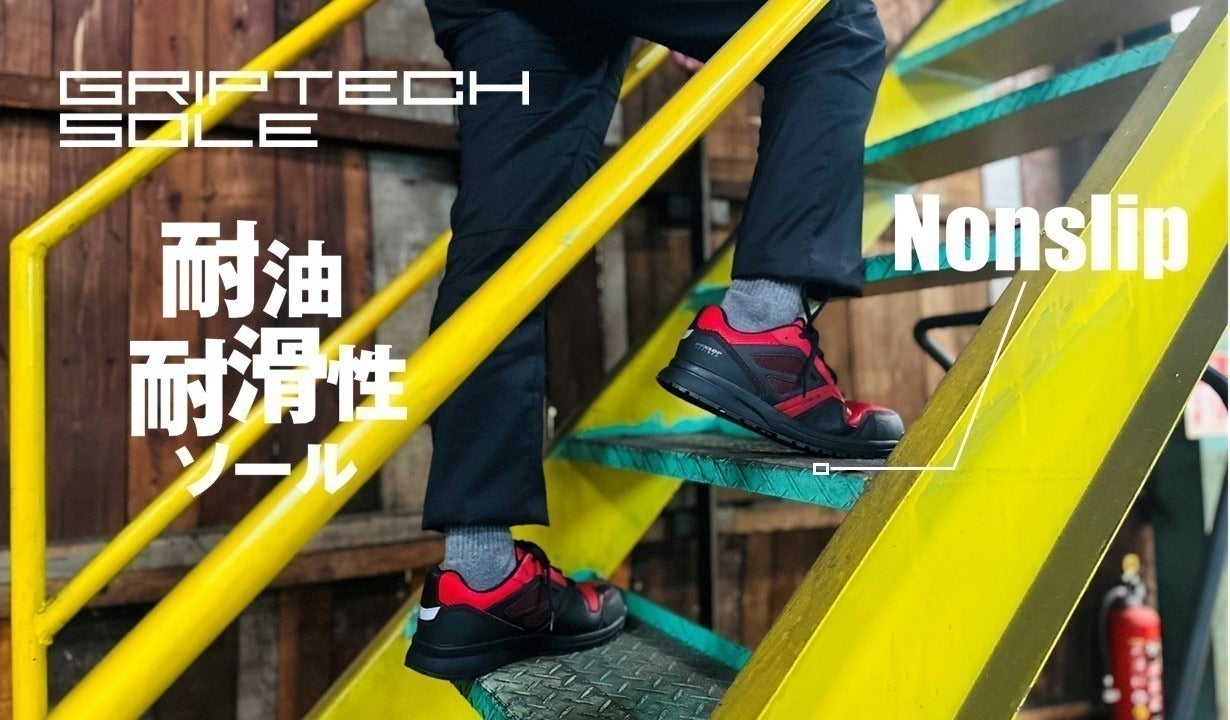 ダンロップリファインドのセーフティースニーカーは、作業シーンに求められるグリップ力の追求をおこない、専用金型を用いて設計し製造された耐滑意匠・耐油配合ラバーソール「グリップテックソール」を採用しています。