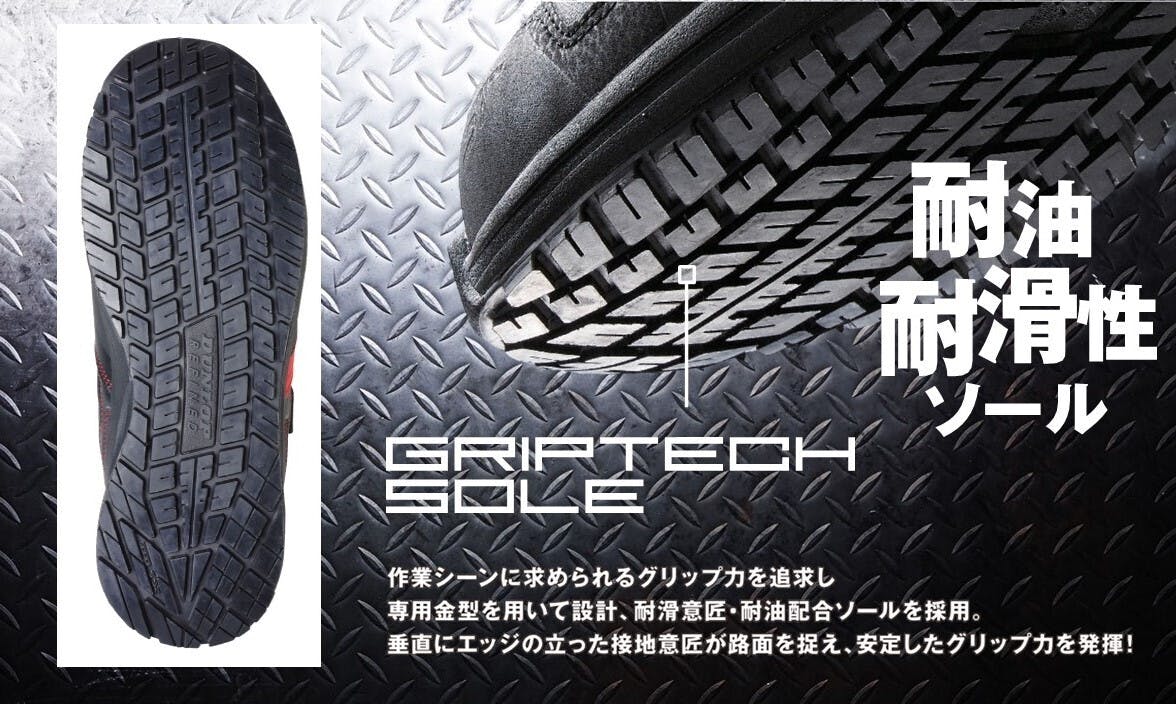 ダンロップリファインドのセーフティースニーカーは、作業シーンに求められるグリップ力の追求をおこない、専用金型を用いて設計し製造された耐滑意匠・耐油配合ラバーソール「グリップテックソール」を採用しています。