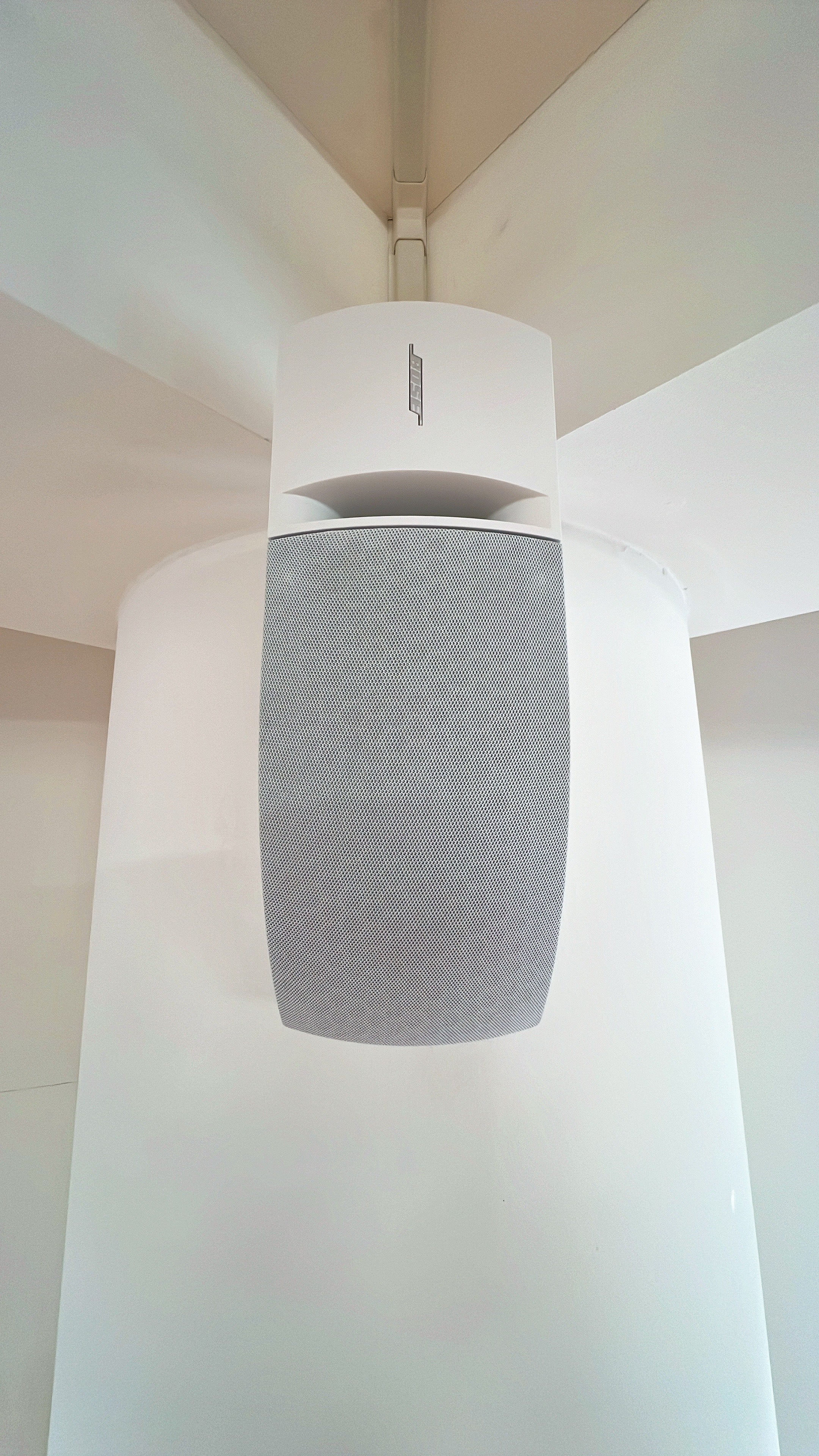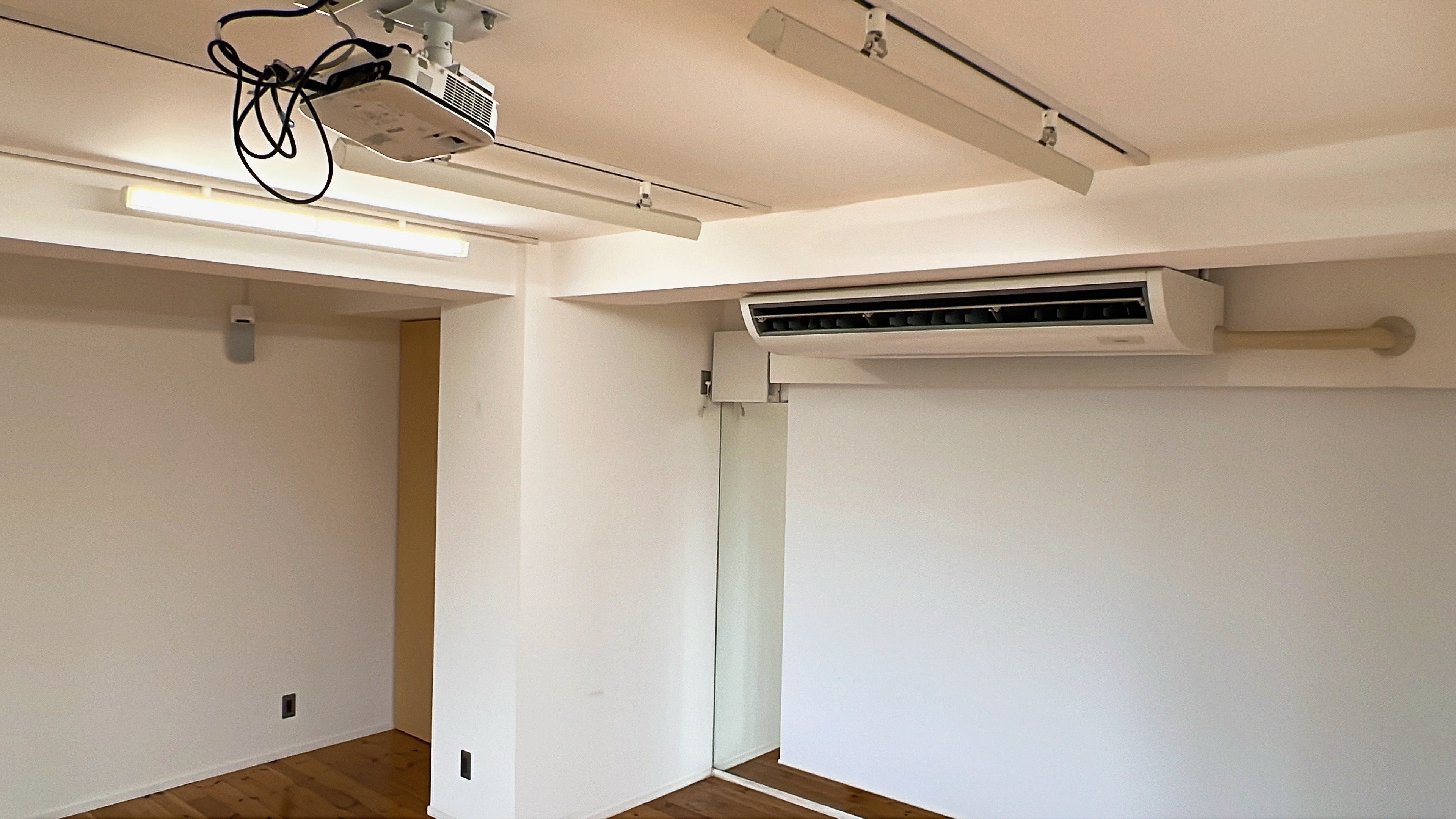 音響機材だけでなく、スクリーンと天井にプロジェクターを設置します。