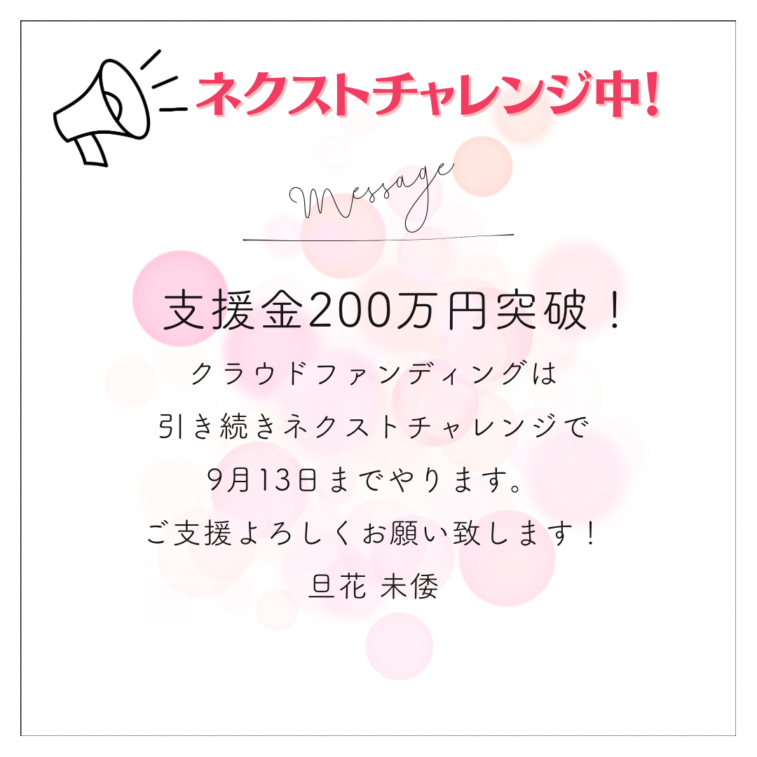 2023/08/26 15:19なんと!ありがたい事に、、、支援金200万円達成!!心より感謝申し上げます(^ ^)本当にありがとうございます♪ もっと見る