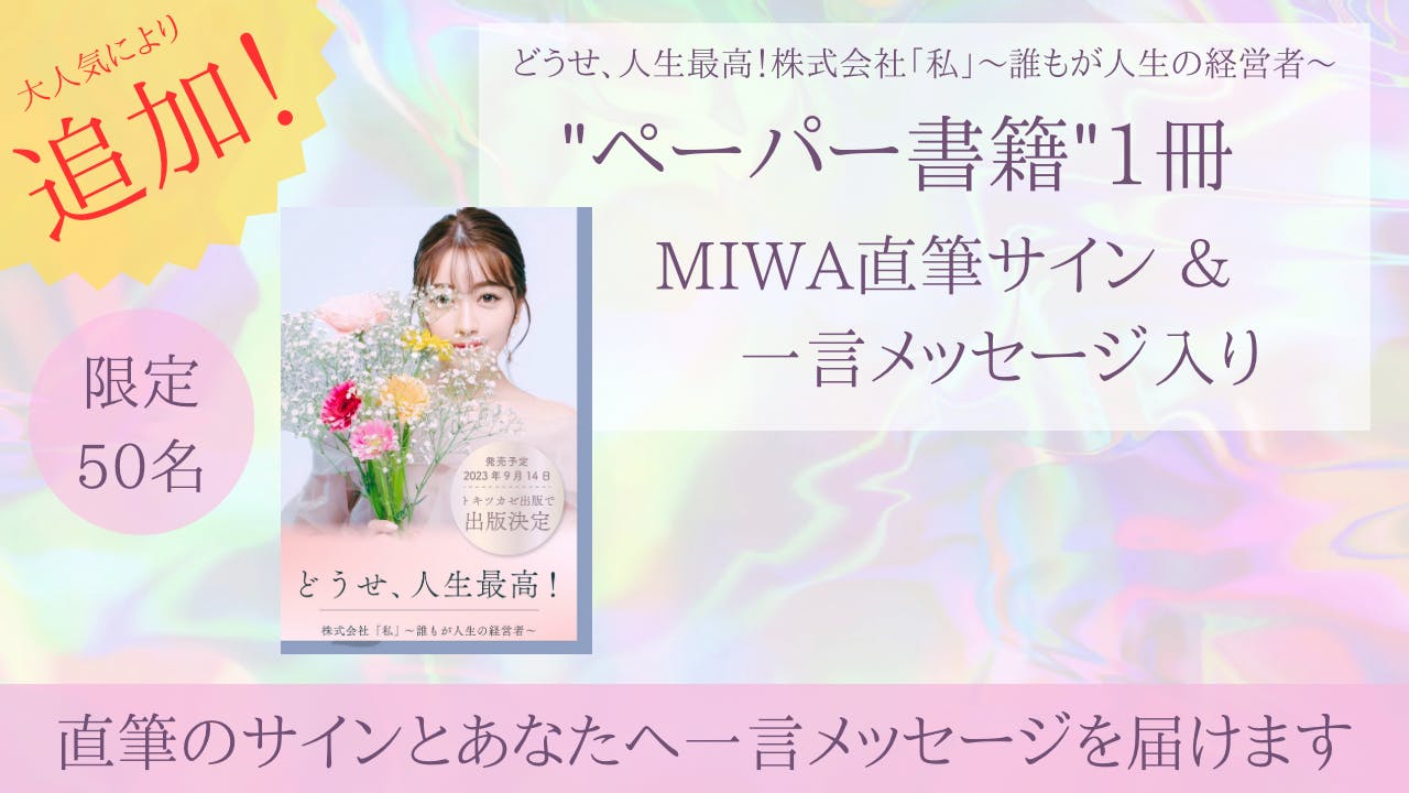 2023/08/23 19:28支援者100名を記念して!【ペーパー書籍&直筆サイン&一言メッセージ】追加リターン 50名限定!★こちらは、MIWA直筆サイン&一言メッセージ付きのリターンです♪一言メッセージのご希望がありましたら、備考欄にお書き下さい!人気すぎて開始12時間で完売してしまい、申し訳ございませんでした。(><)今回支援者100名突破記念として、追加リターンとさせて頂きました。皆様、よろしくお願いいたします(^.^)旦花未倭 もっと見る