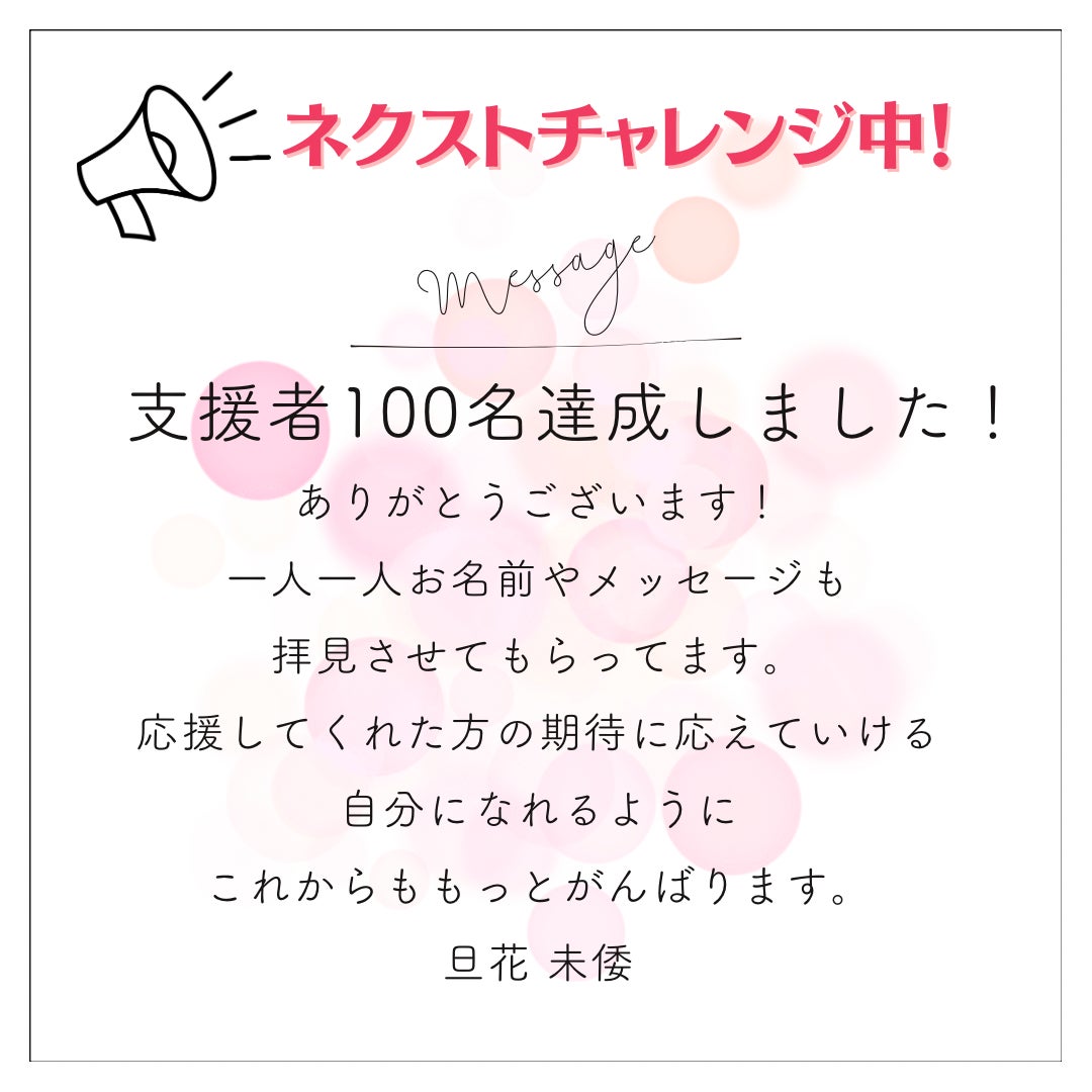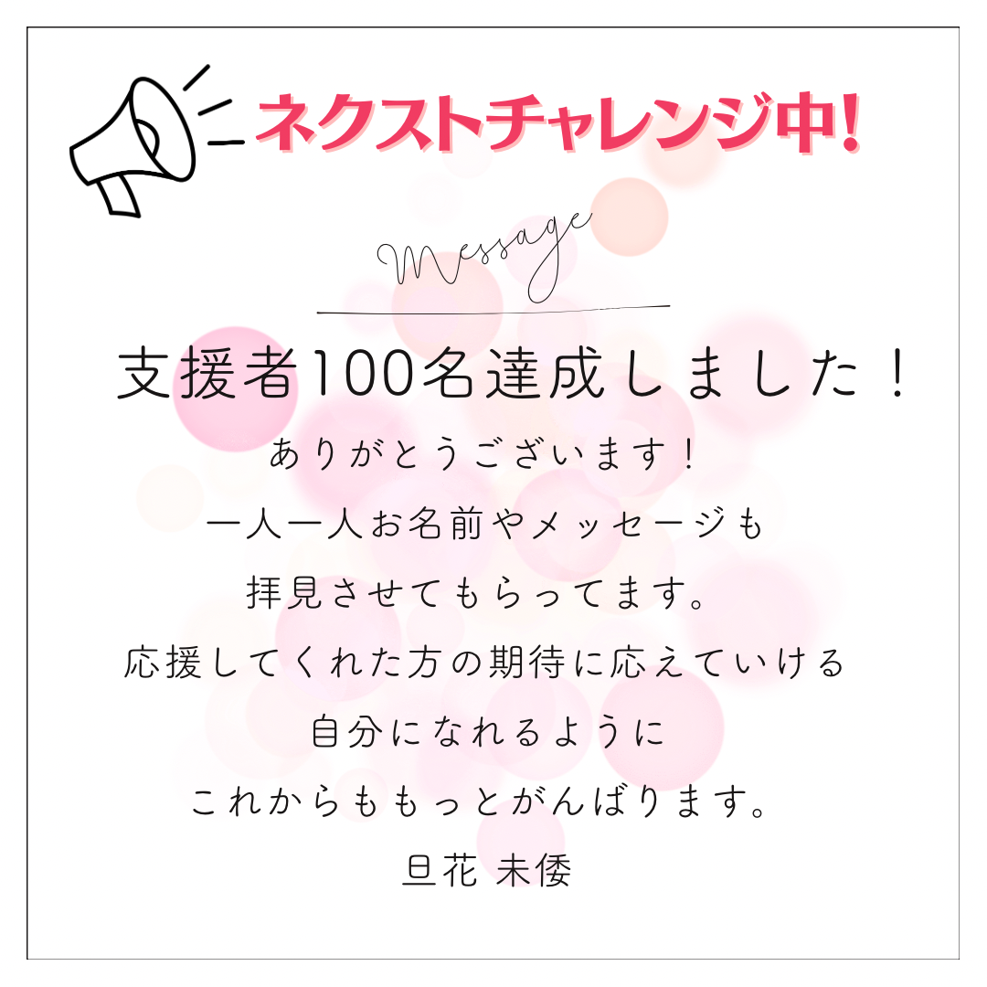 支援者100名突破!クラウドファンディングが開始からわずか12時間で目標を達成し、予想を大きく上回る結果にびっくりと同時に応援してくれた皆さんの一人ひとりの顔が浮かび、感謝で胸がいっぱいです。一人一人お名前やメッセージも拝見させてもらってます。応援してくれた方の期待に応えていける自分になれるようにこれからももっとがんばります。ありがとうございます(^_^)旦花 未倭