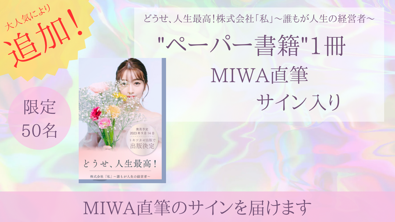 支援者100名を記念して!【ペーパー書籍&直筆サイン】追加リターン 50名限定!★こちらは、MIWA直筆サインのみになります!※一言メッセージは付きませんので、お間違いのないようにお願いします。人気すぎて12時間で完売してしまった為、支援者100名突破記念として、追加リターンとさせて頂きました。皆様、よろしくお願いいたします(^.^)旦花未倭