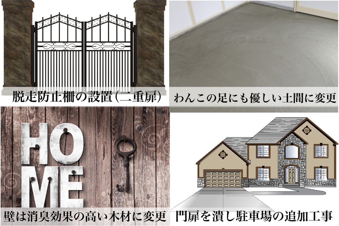脱走防止柵の設置、床材を土間に変更、壁を消臭効果の高い木材に変更、車でもお越しいただけるように駐車場の工事