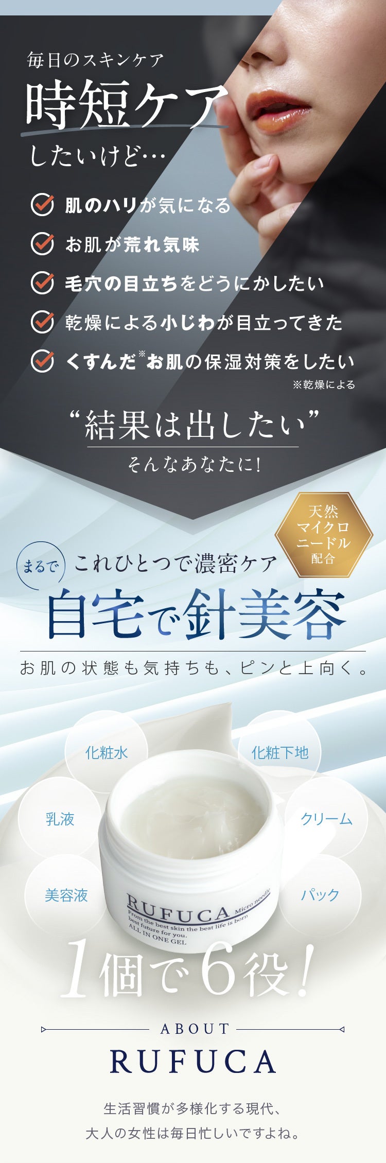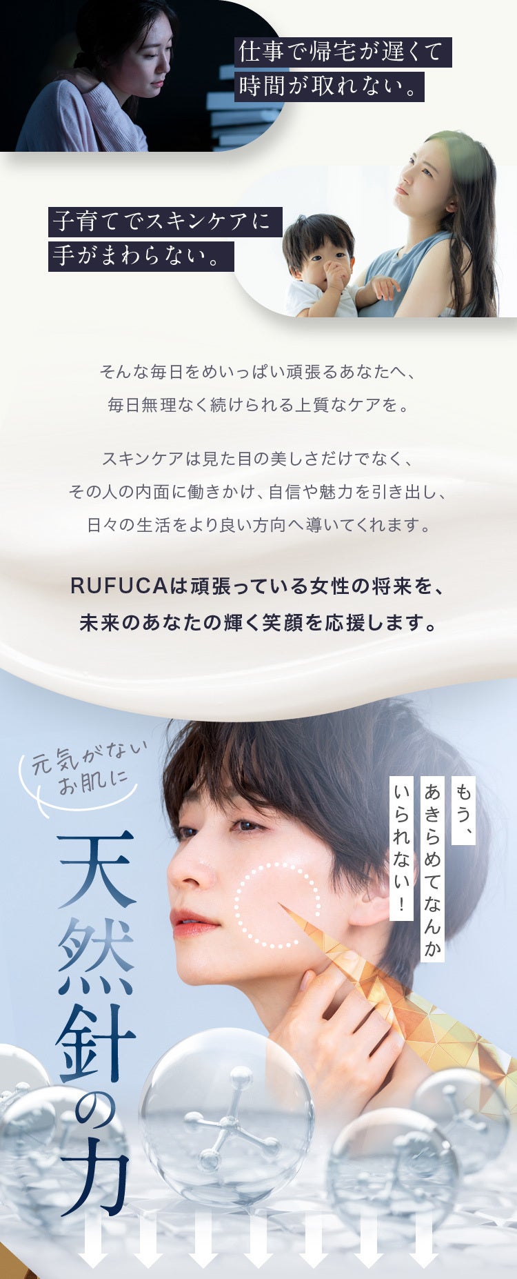 そんなあなたに、そして頑張っているあなたの将来を応援していきたいと思い、商品を開発、RUFUCAというスキンケアブランドを立ち上げました。5年後、10年後も輝き続けられるよう応援していきます。