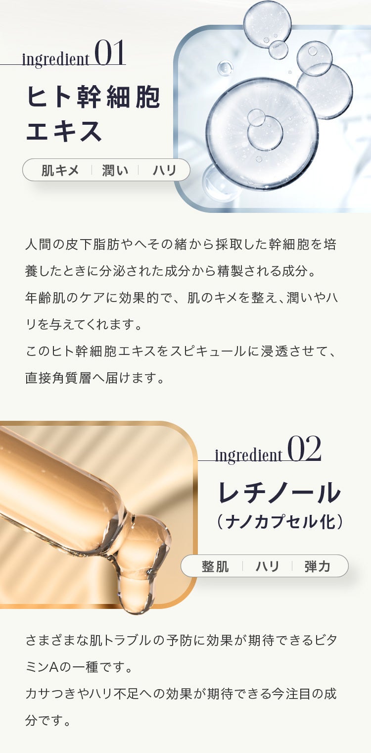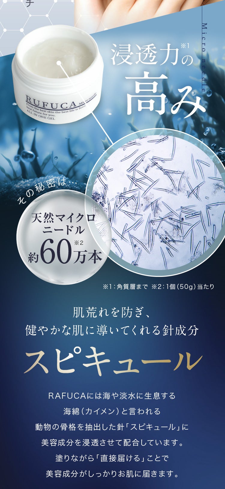 今回、弊社が開発したマイクロニードルオールインワンジェル(50g 約1ヶ月分)には、肉眼では見えない針状の成分:マイクロニードル(スピキュール)という針が配合されています。そのマイクロニードルに今話題の美容成分:レチノールやヒト幹細胞、CICA、スクワランなどを独自の技術で浸透させ、美容成分がしっかりと角質層にまで浸透してくれるような商品となっております。