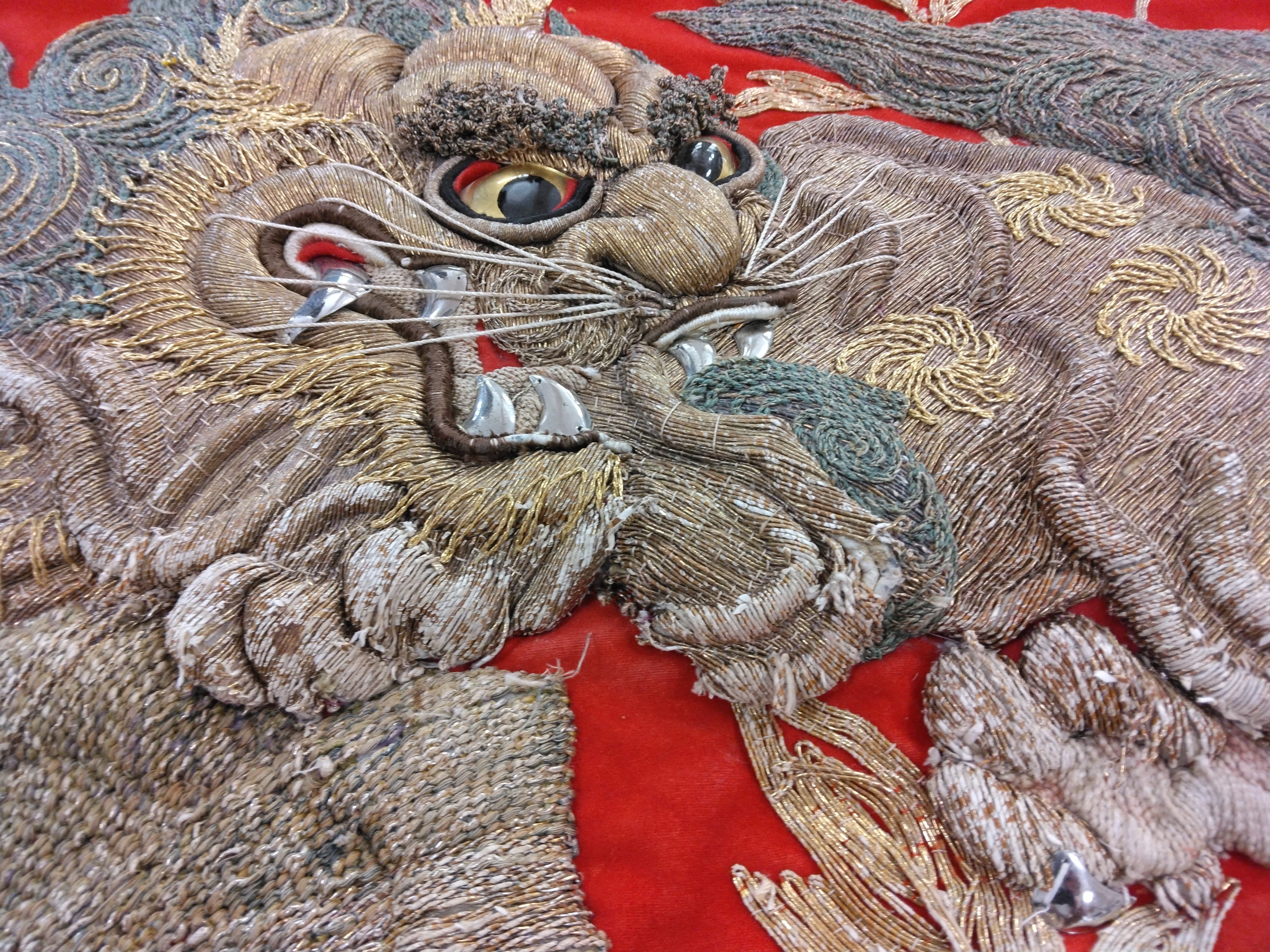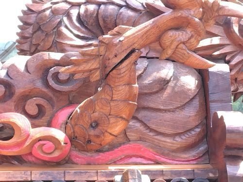 太鼓台の屋根を飾る彫り物や擬宝珠などの部品が各所で破損し、内陣を飾る水引幕も色が褪せ、刺繡の糸がほとんどほつれてきました。今までは応急処置をしてなんとか持ちこたえてきましたが、、屋根も含め本体そのものも緩んできました。