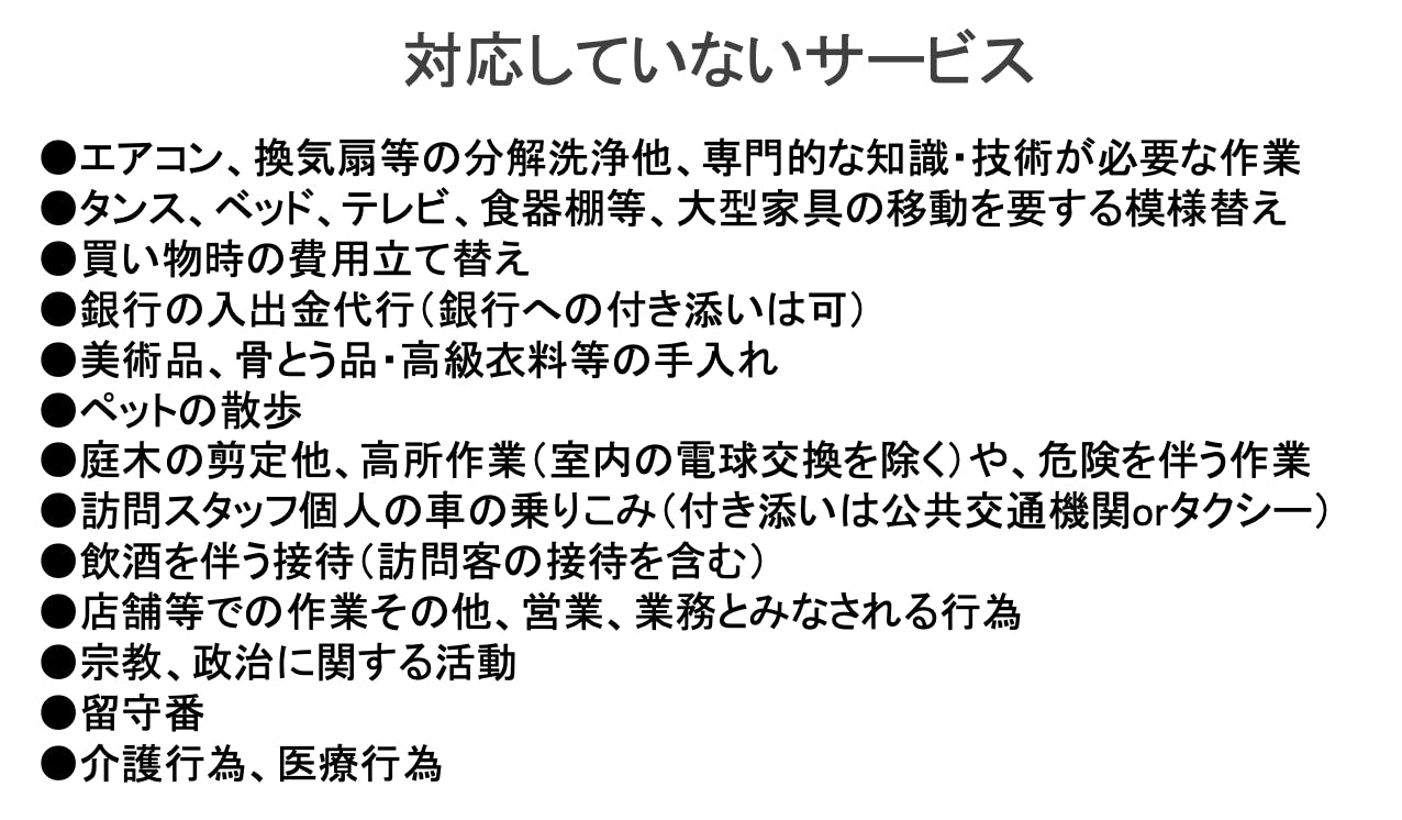 また、ヘルパーの方は、あらかじめケアマネージャーが作成した「介護計画」にない家事については、してはいけないのがルールです。やってあげたくても手を出せずに、罪悪感を抱いている現状があります。