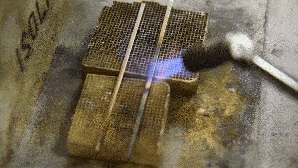シルバーの地金全体に均等に火を当ててうっすら赤みを帯びるまで熱します。金属の中の繊維をほぐし、曲げなどの加工をしやすくする工程です。