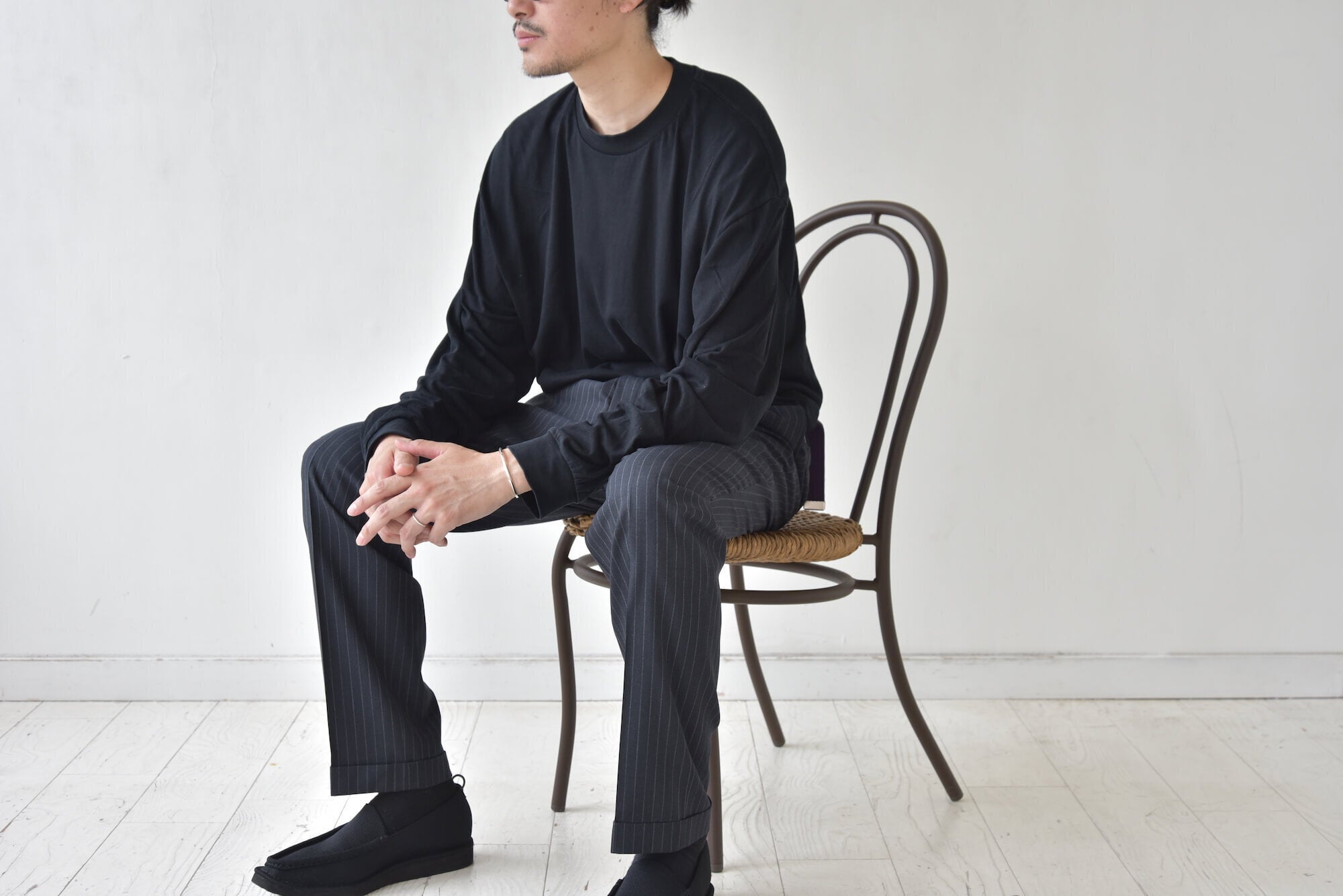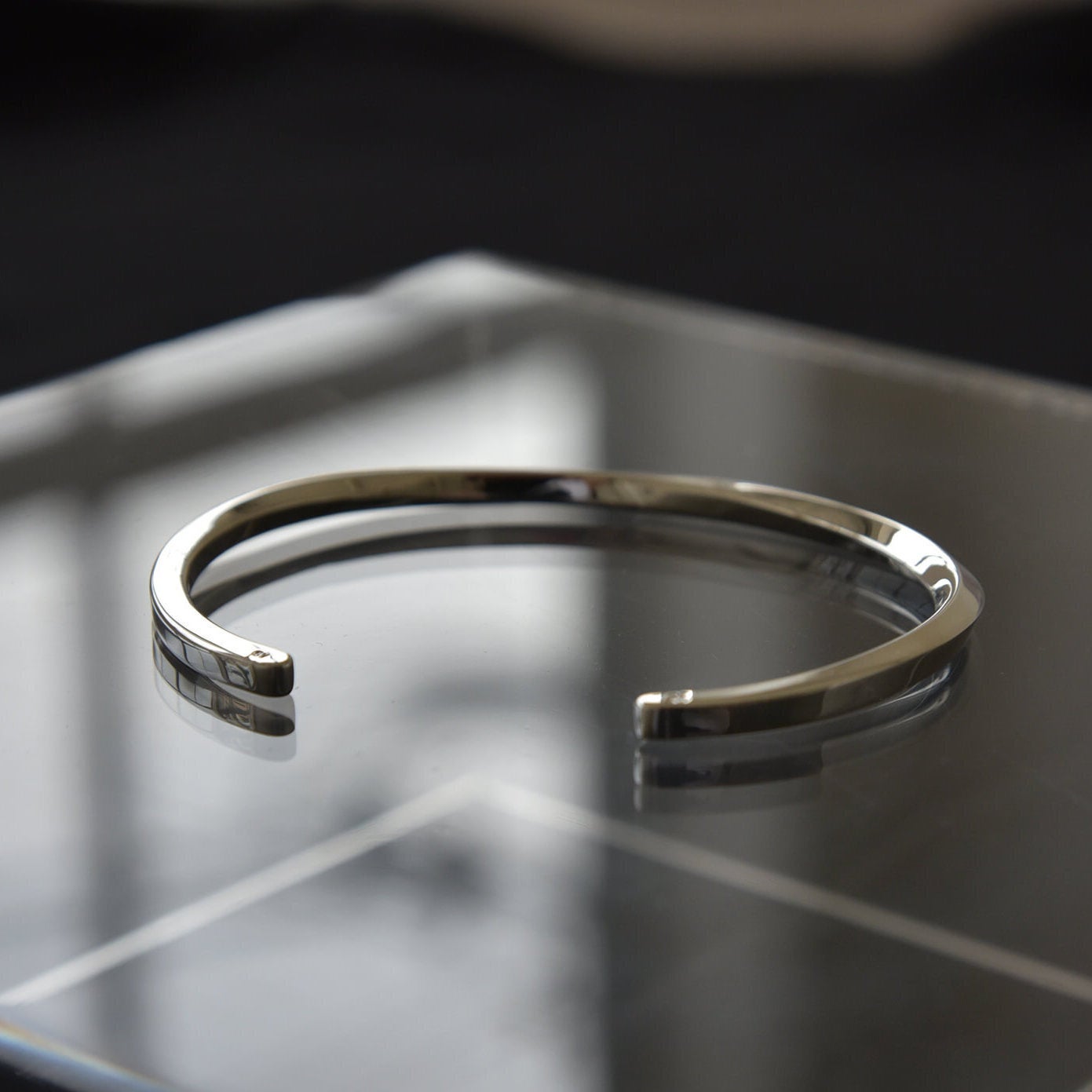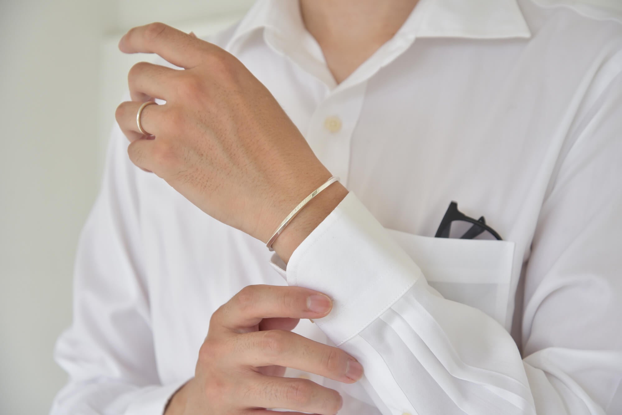 今回は何度もサンプル制作を経て選び抜いた「3mm」の厚みを使用することによって男性でも女性でも主張しすぎず大人の装いにハマるデザインに仕上がっています。