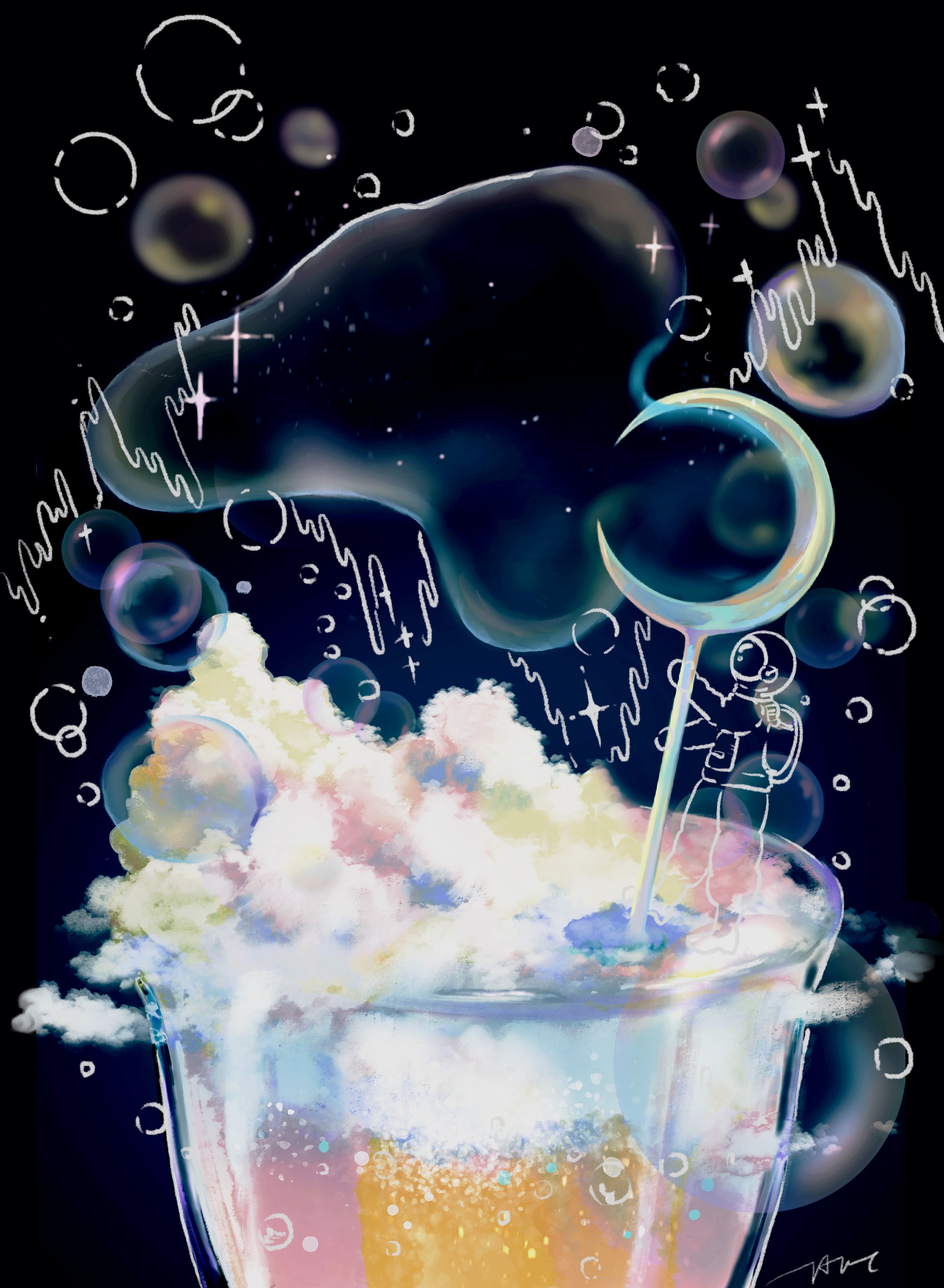 しゃぼん玉の泡とビールの泡が夏の夜に弾ける様子を想像しながら描きました。