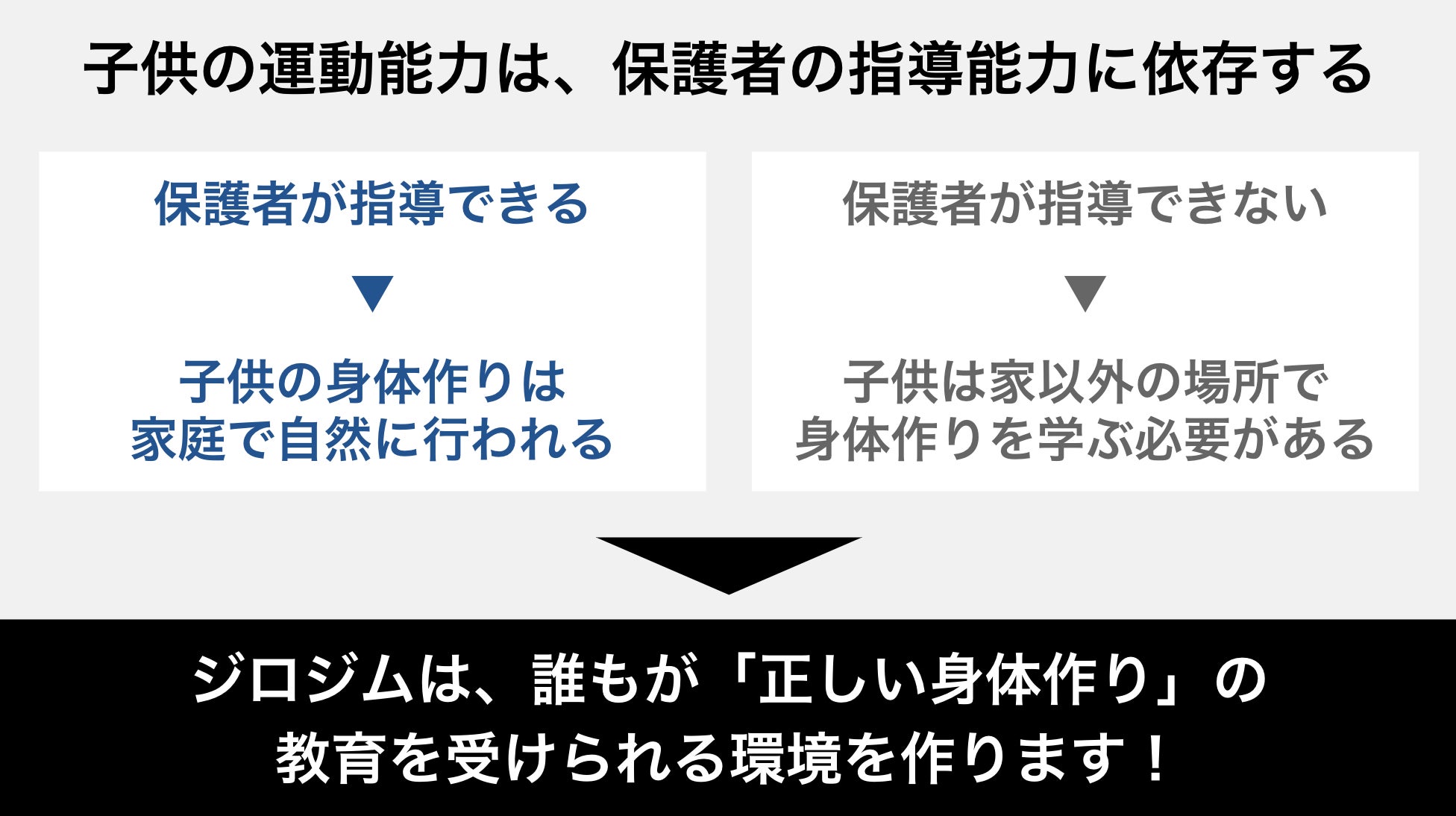 この度、欧米諸国に大きく遅れをとっている日本の運動教育をアップデートしたいとの思いから、親子参加型のジムスクール「ジロジム」を立ち上げるにいたりました。