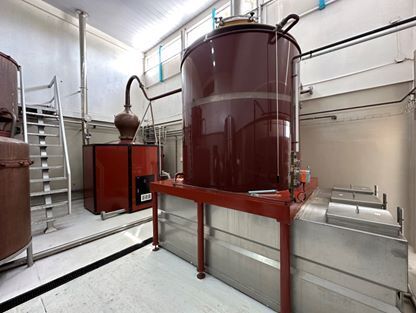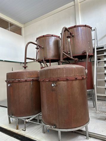 Rujeroでは古い蒸溜器(ファルカ)と最新式の蒸溜器(コニャックシャラント式)の2つを使用して蒸溜しております。シンガニの主原料であるマスカット・オブ・アレキサンドリアの実を収穫後すぐに圧搾し、発酵用の樽に詰めてまずワインをつくり、その後、蒸溜します。蒸溜直後は70度程度のアルコール度数がありますが、水を加えて度数調整をして出荷します。無色透明ながら、マスカットの甘い香りが漂います。アルコールは40%と高めです。